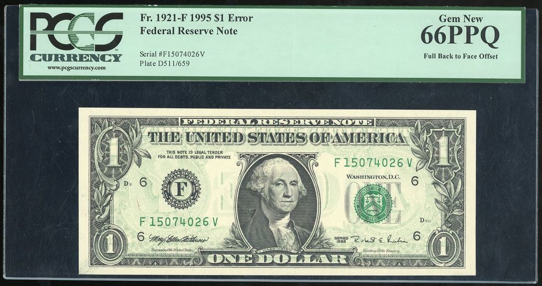 United States, ERROR $1, 1995, serial number F15074026V, full back to face offset,