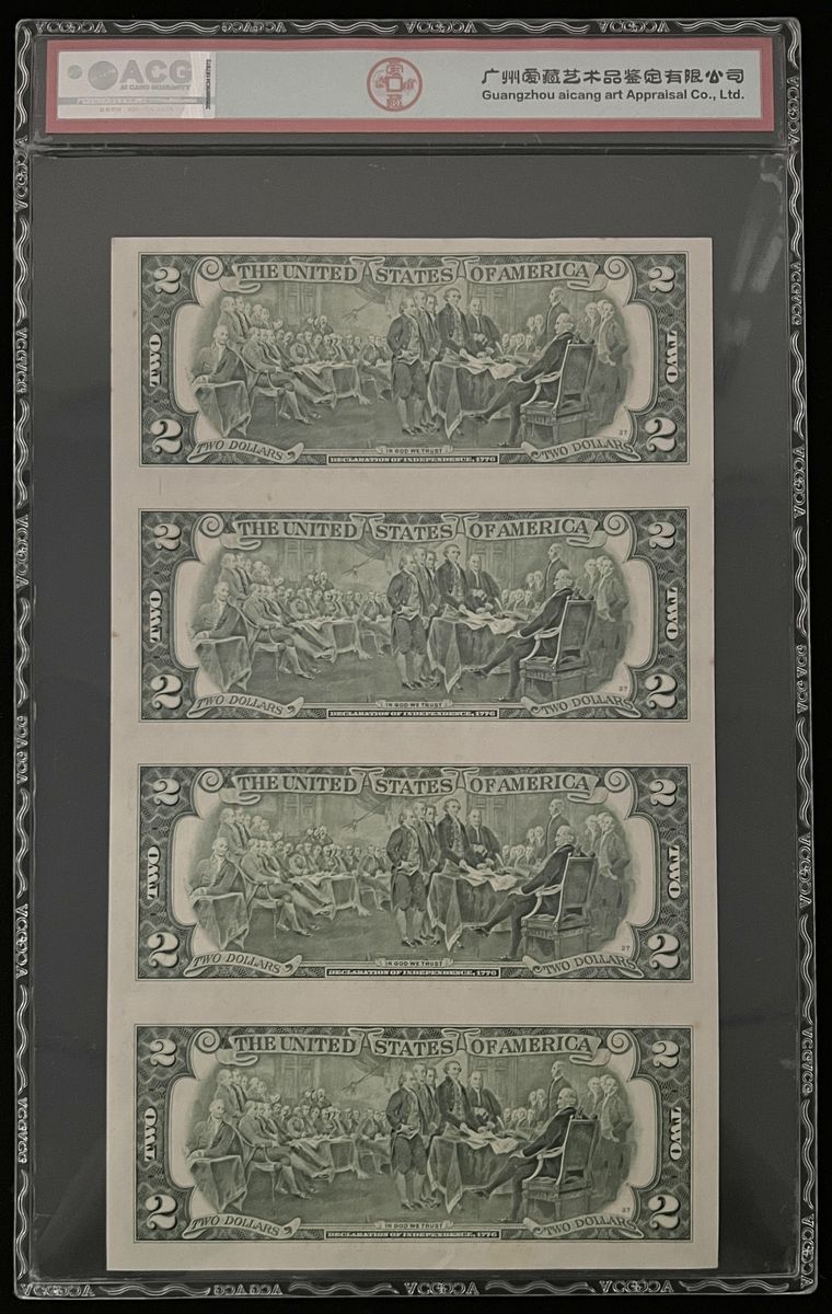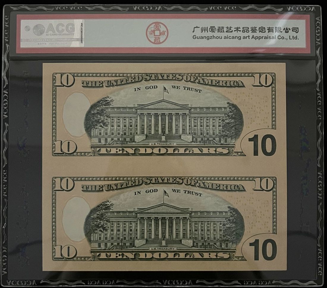 美國一組三枚連體鈔, 包括 2001年4連體1元, 2003年4連體2元, 2006年2連體10元, ACG 63EPQ, 63EPQ, 66EPQ