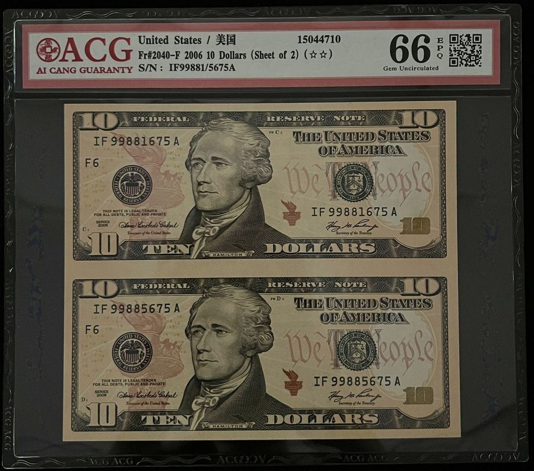 -uncut sheet of two $10, 2006, ACG 66EPQ
