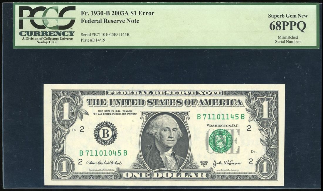 United States, $1, 2003A, error, mismatched serial number B71101045B/71101145B, PCGS Currency 68PPQ.