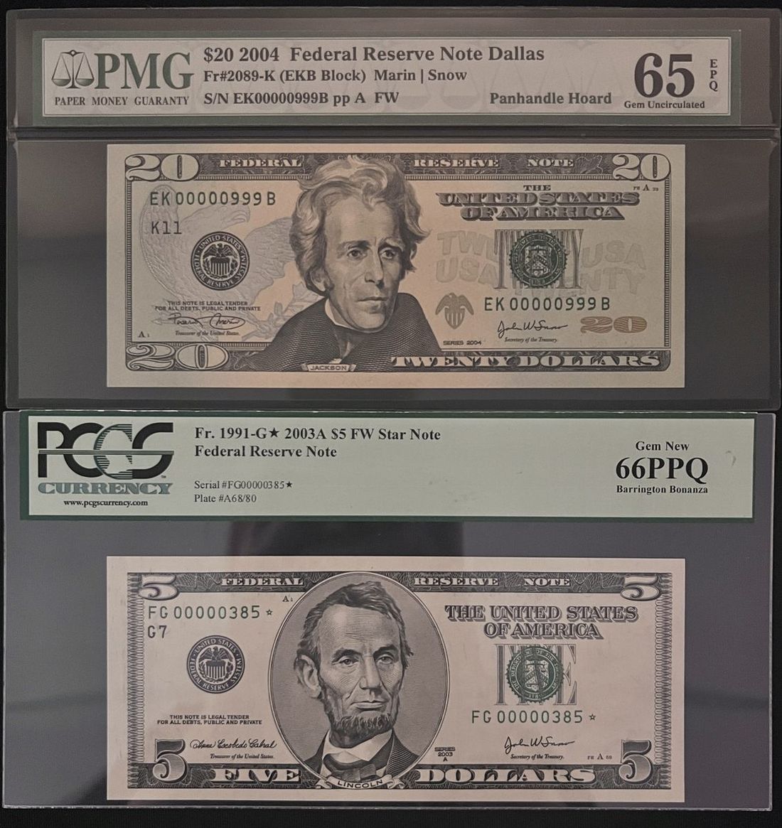 The United States, Federal Reserve Note, a pair of $5 and $20, 2003A and 2004, serial numbers FG00000385 and EK00000999B ppA, (FR. 1991-G* and FR#2089-K), graded PCGS Currency 66PPQ and PMG 65EPQ respectively (2).