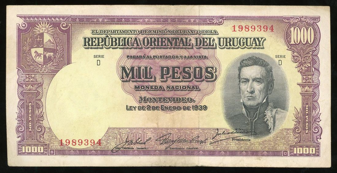 Bank of Oriental Republic of Uruguay, 1000 pesos, 1939, serial number 1989394, (Pick 41c(1)), very fine or so.