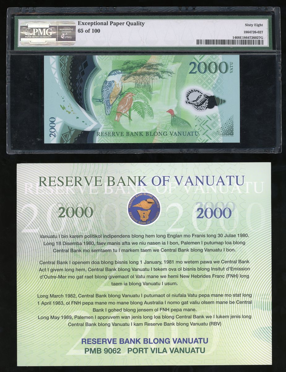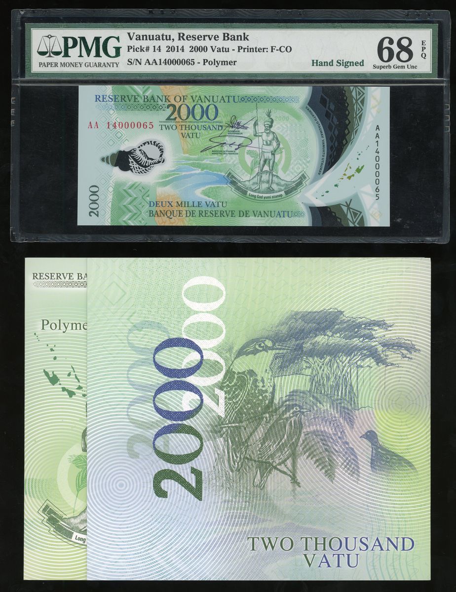 2014年溫納圖塑膠2000 vatu, 編號 AA14000065, 僅發行100枚手簽版, 連原盒. PMG 68EPQ