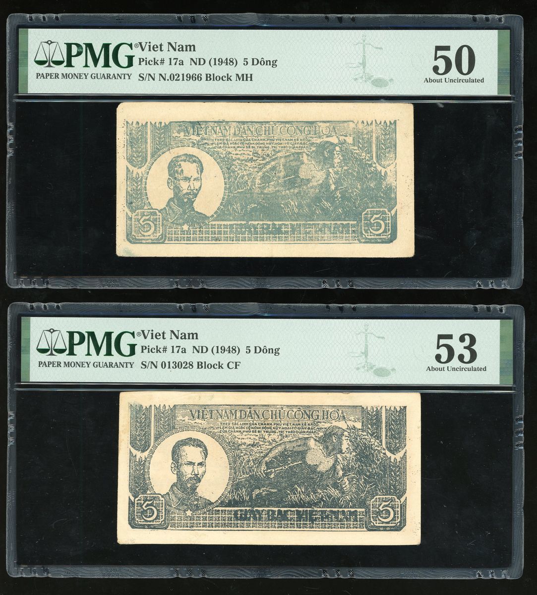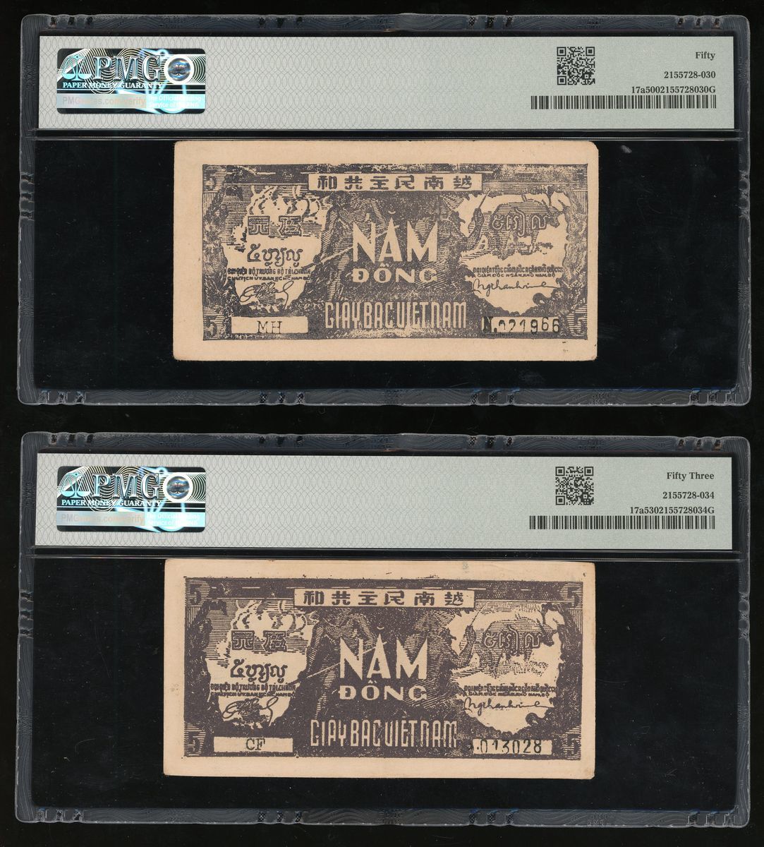 Democratic Republic of Vietnam, a pair of 5 dong, ND (1948), serial numbers CF 0130028 and MH 021966, one with black front and purple back, the other green front and brown back,