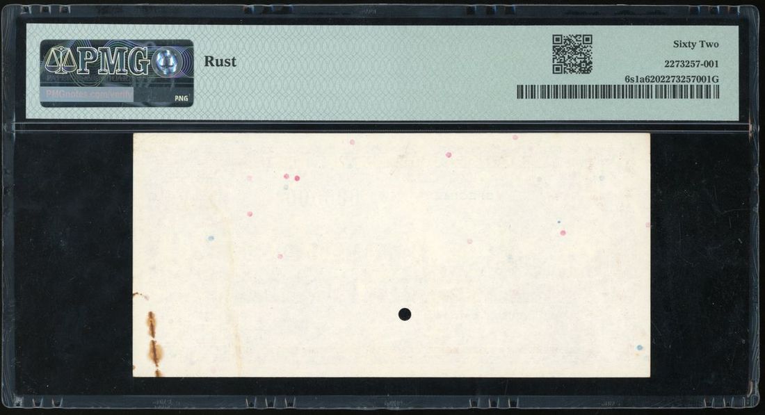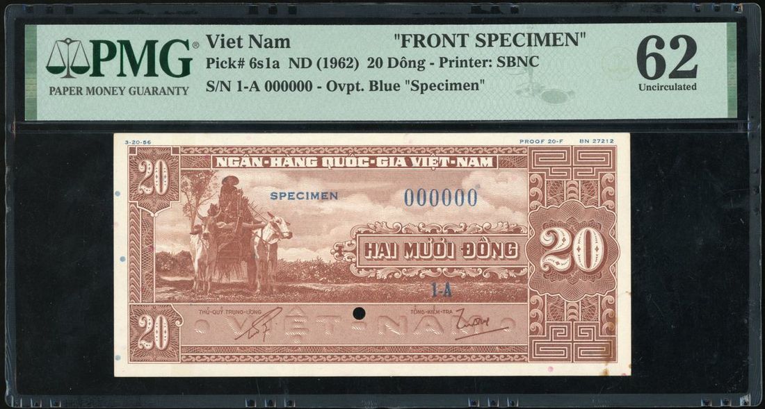 1962年越南20盾樣票, 編號 1-A 000000, PMG 62, 有銹漬
