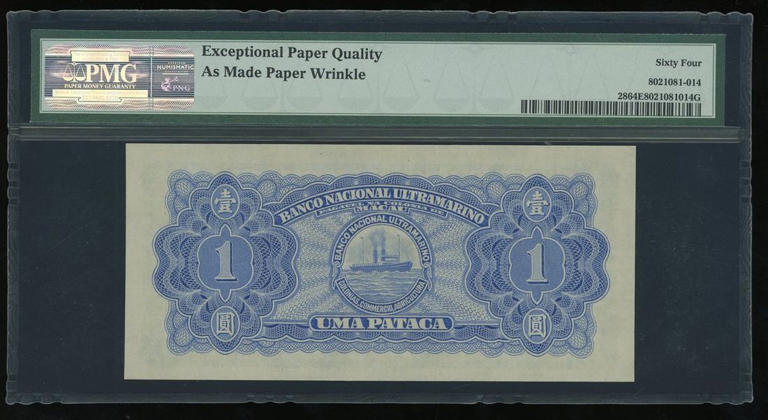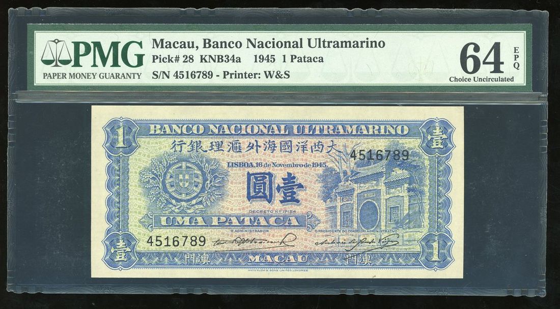 Banco Nacional Ultramarino, Macau, 1 pataca, 1945, serial number 4516789, (Pick 28), PMG 64EPQ Choice Uncirculated (As Made Paper Wrinkle)