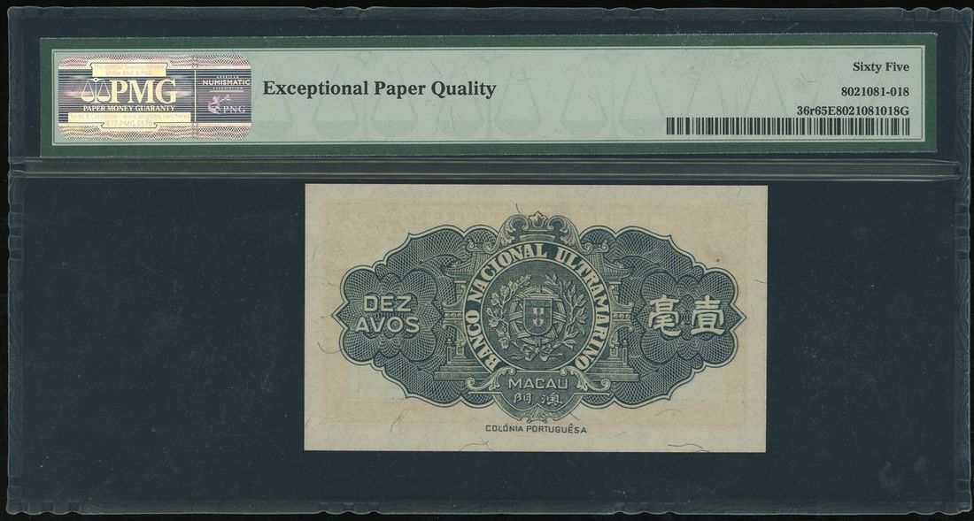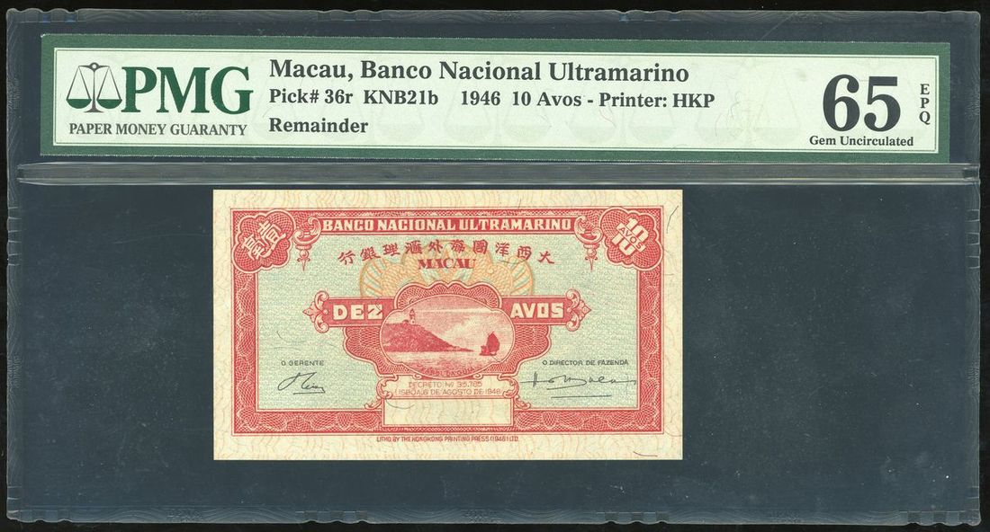 Macau, 10 avos, 1946, remainder, without serial number, (Pick 36r), PMG 65EPQ.