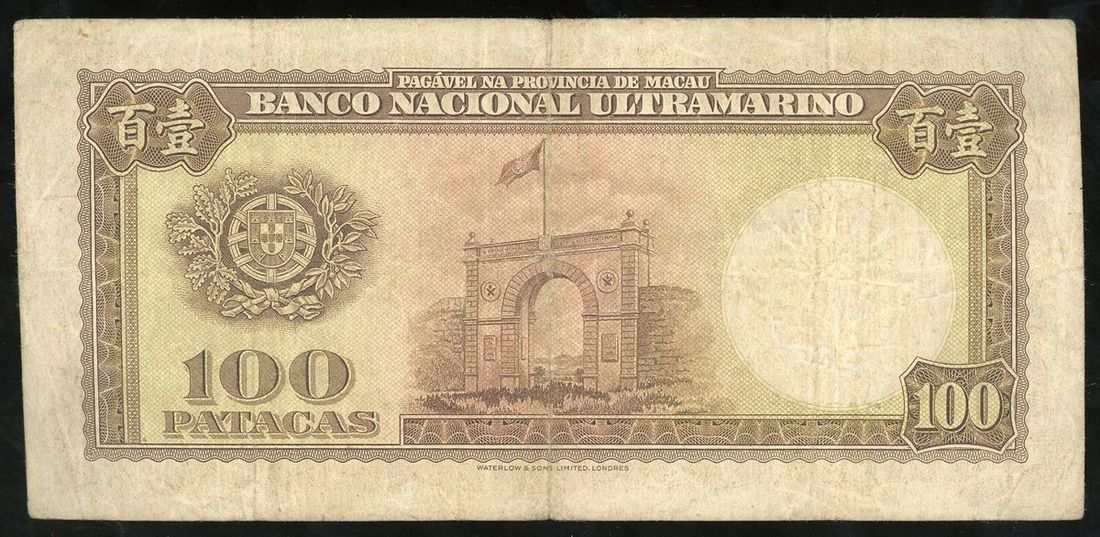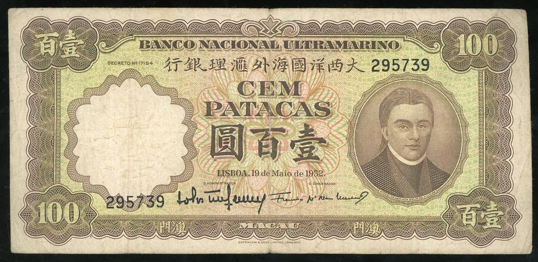 Banco Nacional Ultramarino, Macau, 100 patacas, 19 May 1952, serial number 295739, (Pick 44a), fine, scarce type. Sold as is, no return.