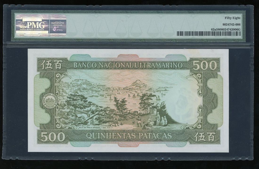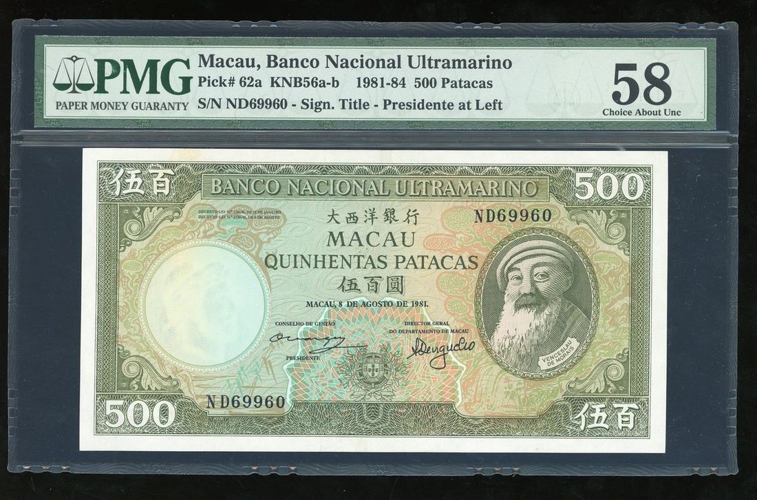 Banco Nacional Ultramarino, Macau, 500 patacas, 1981, serial number ND69960, (Pick 62a), PMG 58 Choice About Uncirculated