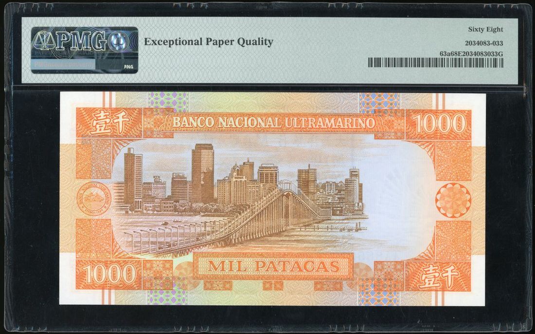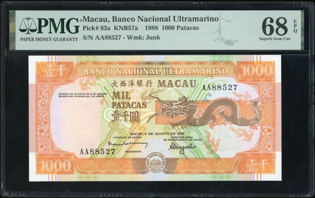Banco Nacional Ultramarino, Macau, 1000 patacas, 1988, serial number AA88527, (Pick 63a), PMG 68EPQ Superb Gem Unc