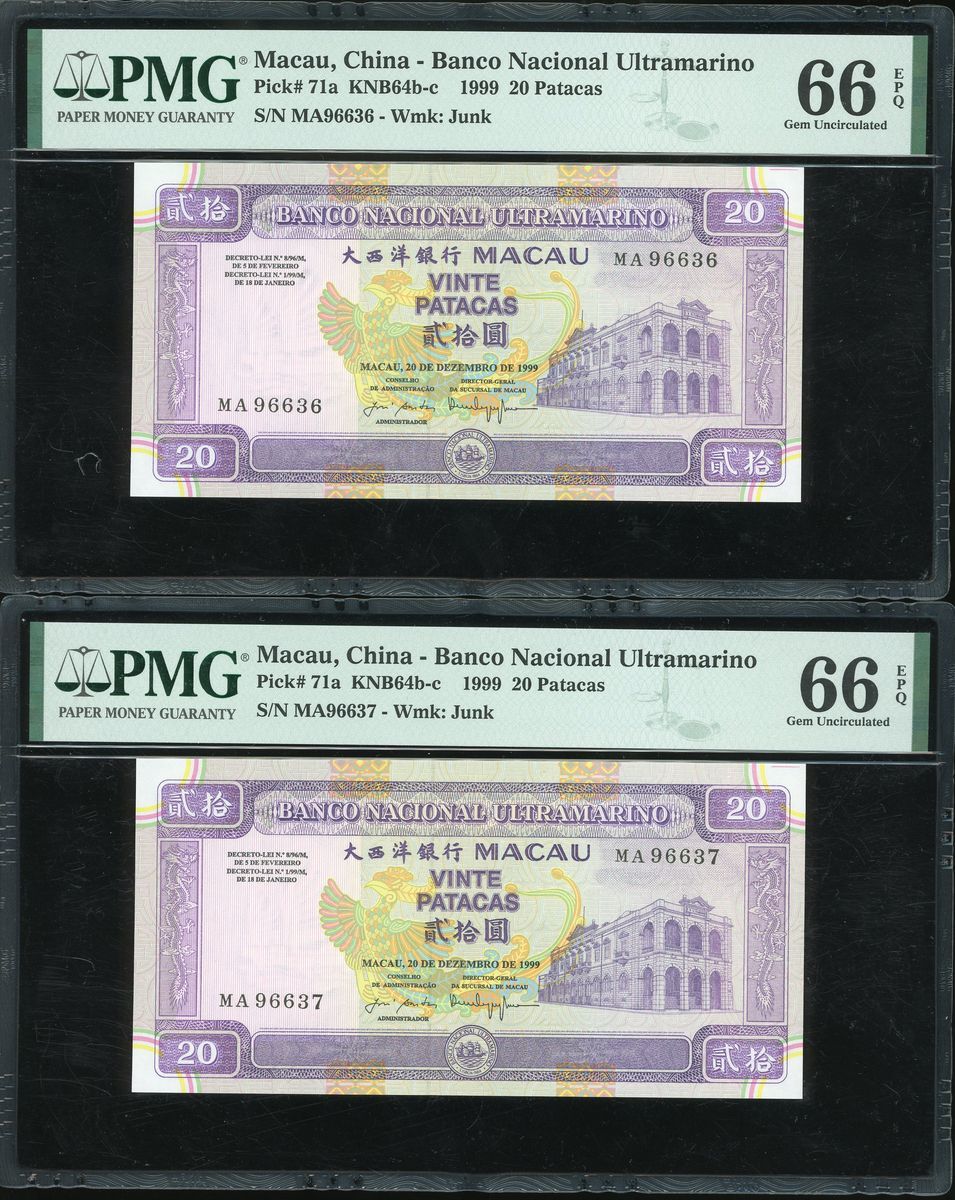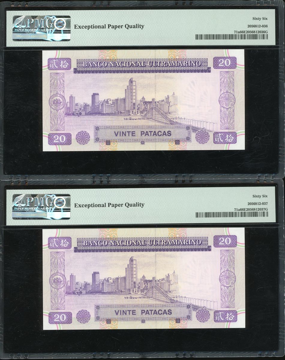 Macau, Banco Nacional Ultramarino, a pair of consecutive 20 patacas, 1999, serial numbers MA96636-637, (Pick 71a), both graded PMG 66EPQ Gem Uncirculated.