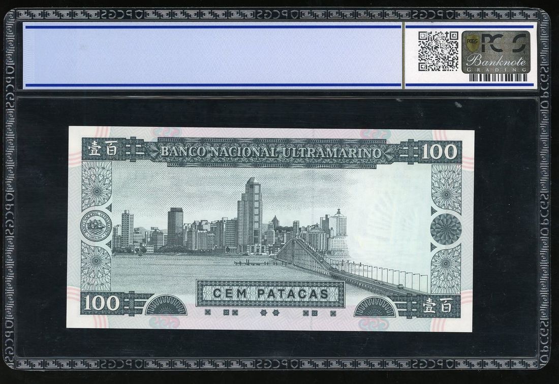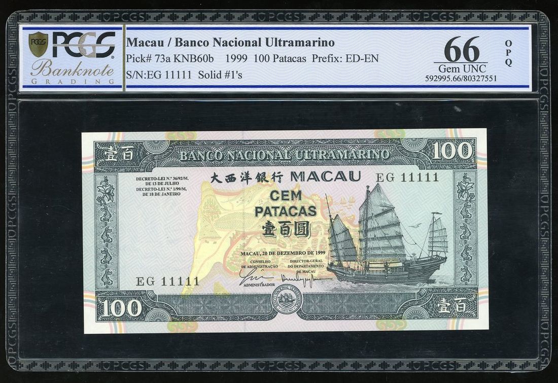 Banco Nacional Ultramarino, Macau, 100 patacas, 1999, solid serial number EG 11111, (Pick 73a), PCGS 66OPQ Gem Uncirculated