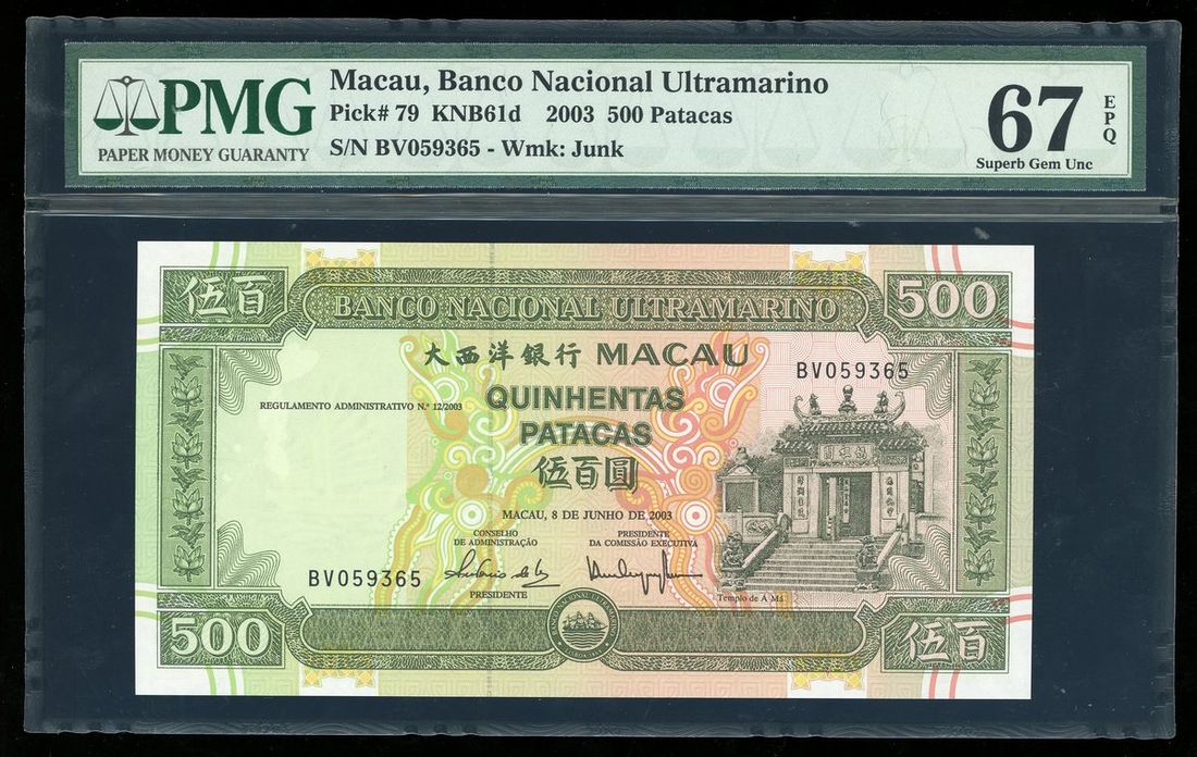 2003年澳門大西洋海外匯理銀行伍百圓,編號BV059365,PMG 67EPQ