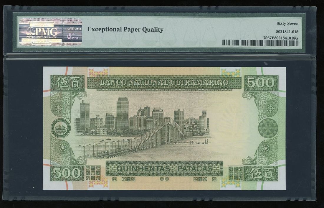 Banco Nacional Ultramarino, Macau, 500 patacas, 2003, serial number BV059365, (Pick 79), PMG 67EPQ Superb Gem Uncirculated