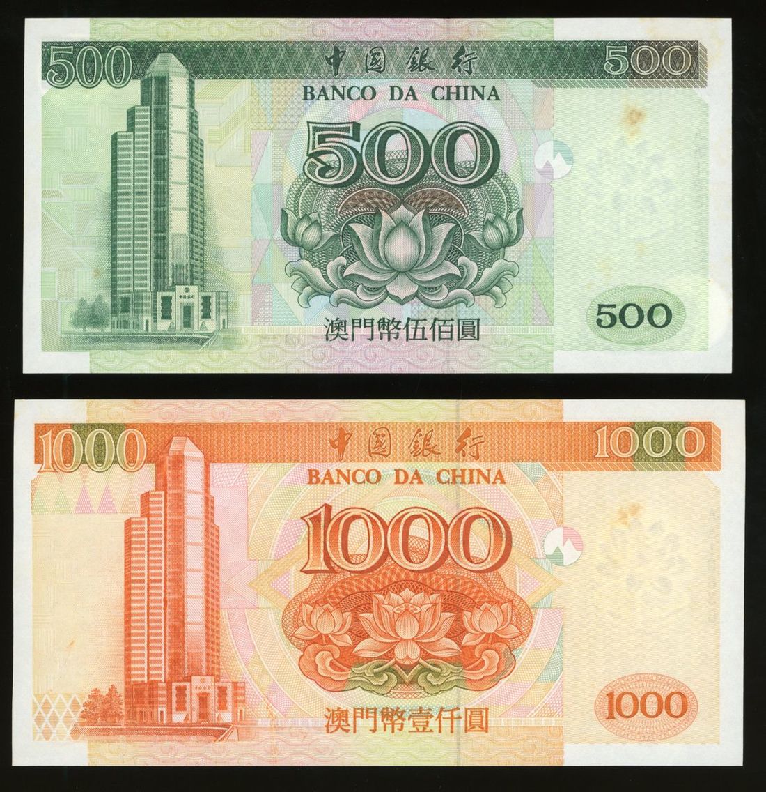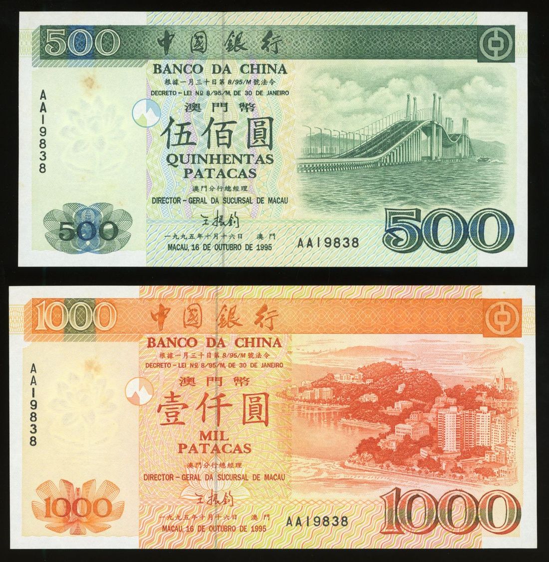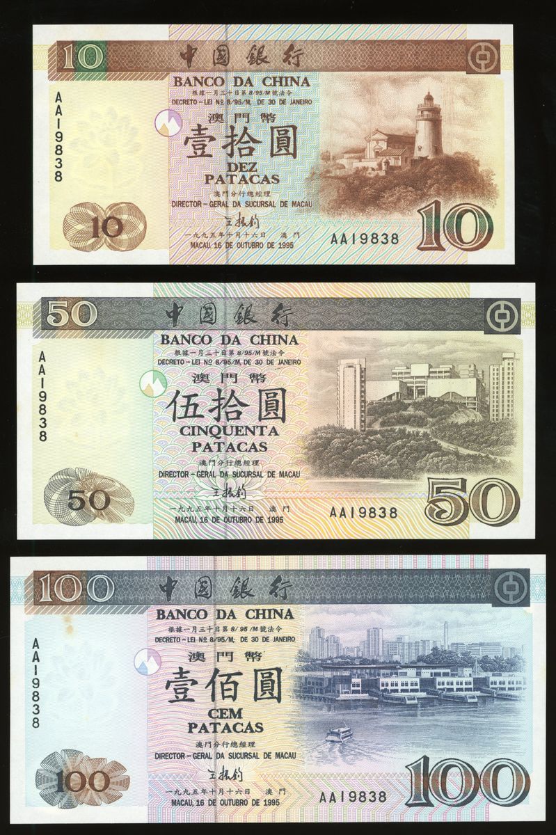 Banco da China, Macau, a complete set of 1995 series, 5 notes in total, consists of 10, 50, 100, 500 and 1000 patacas, 1995, AA prefix matching serial number AA19838, (Pick 90-95), about uncirculated or so, several with toning spots, viewing recommended, sold as seen no return (a group of 5).