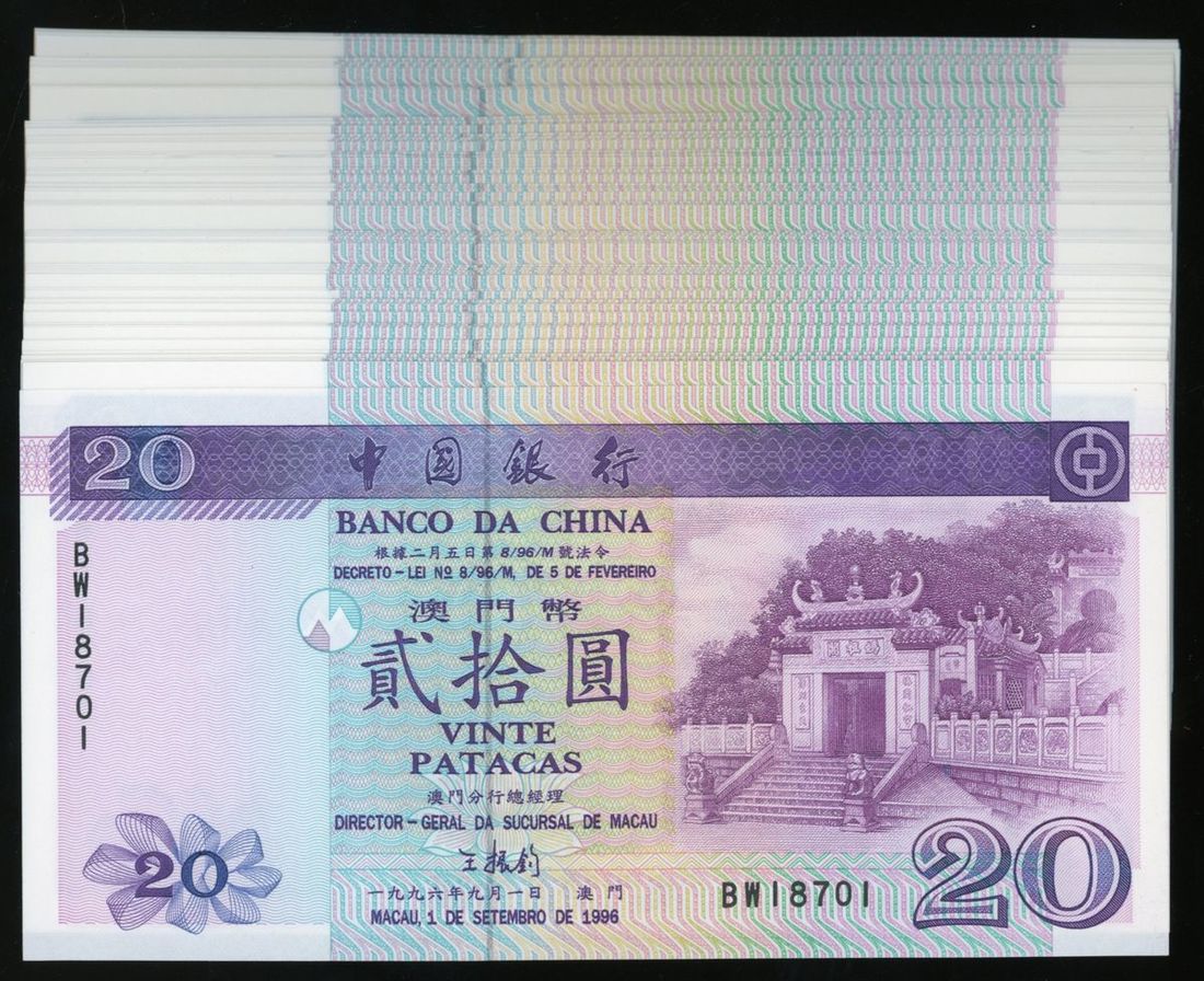 1996年中國銀行(澳門)一組81枚貳拾圓,近乎連號,UNC品相