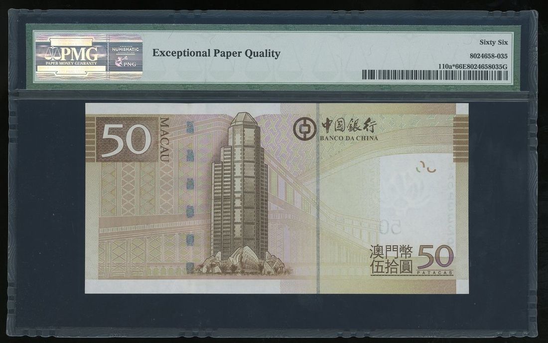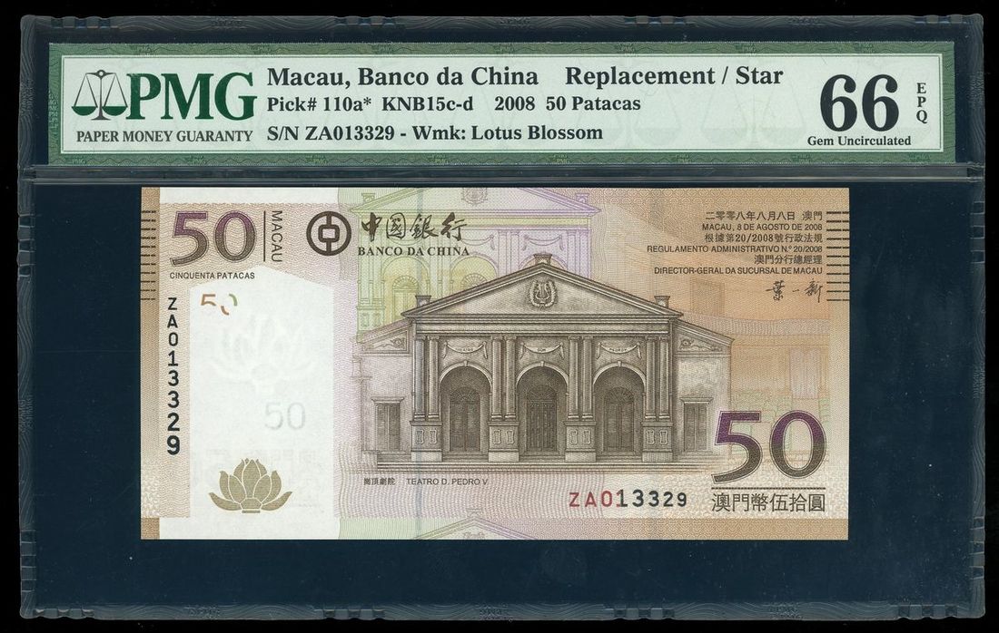 2008年中國銀行(澳門)伍拾圓,補號ZA013329,PMG 66EPQ
