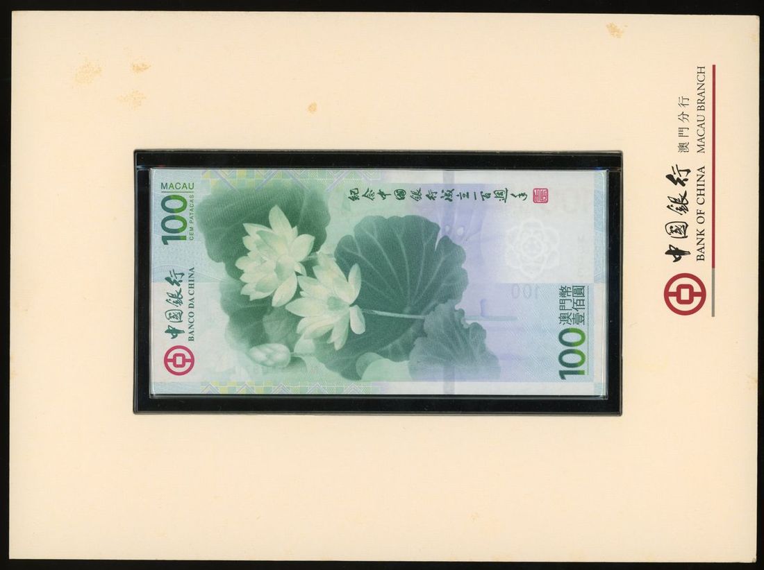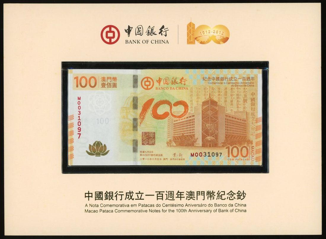 Banco Da China, Macau, 100 patacas, 5.2.2012, serial number MO031097, 100th Anniversary of the Bank commemorative issue,