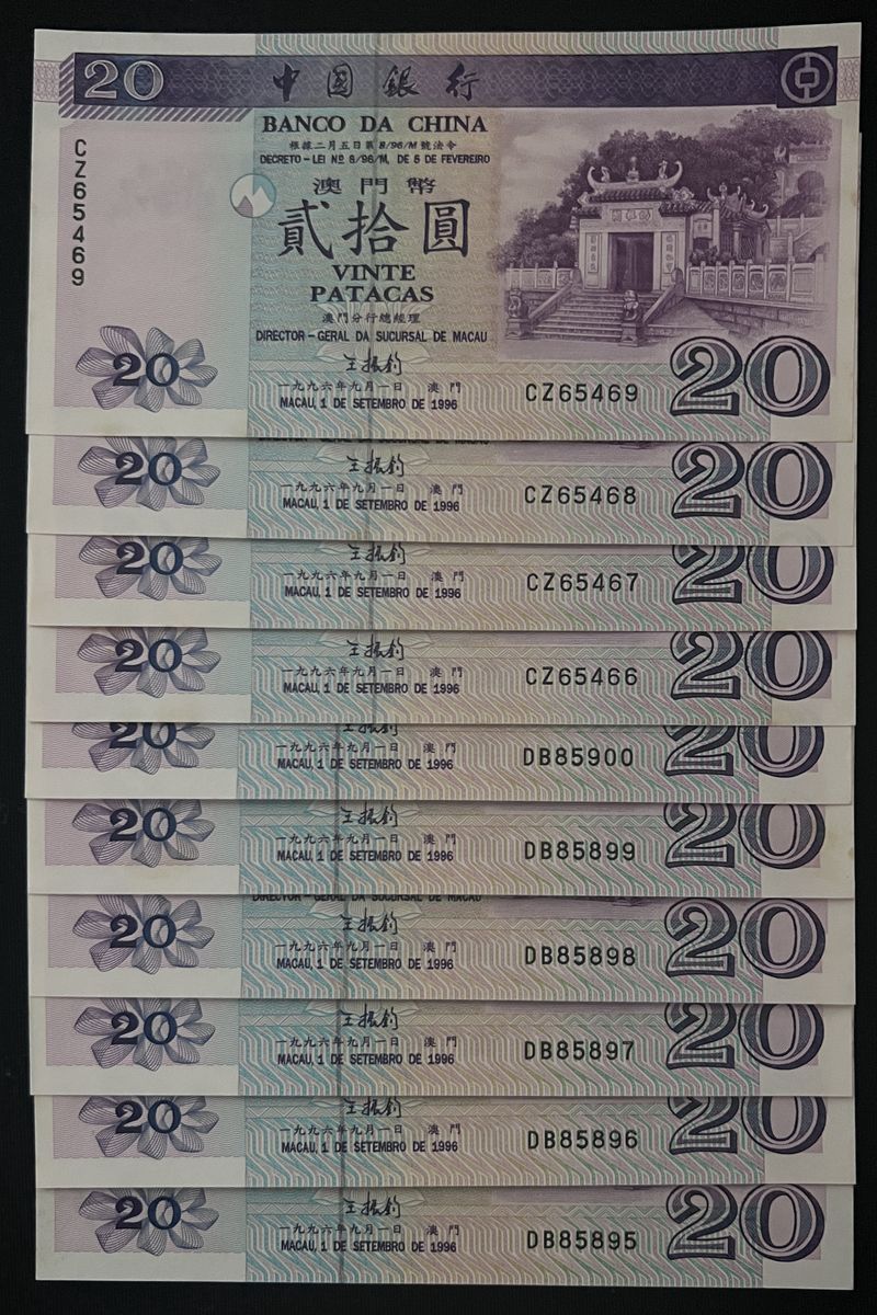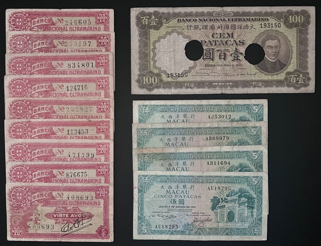 Macau, a group of 42x notes, including BNU, 20 avos (9) ND (1944), cancelled 100 patacas 1952, 5 patacas (4) 1981, 10 patacas (12) 1991, Banca da China, 10 patacas (7) 1995, 20 patacas (10) 1996,