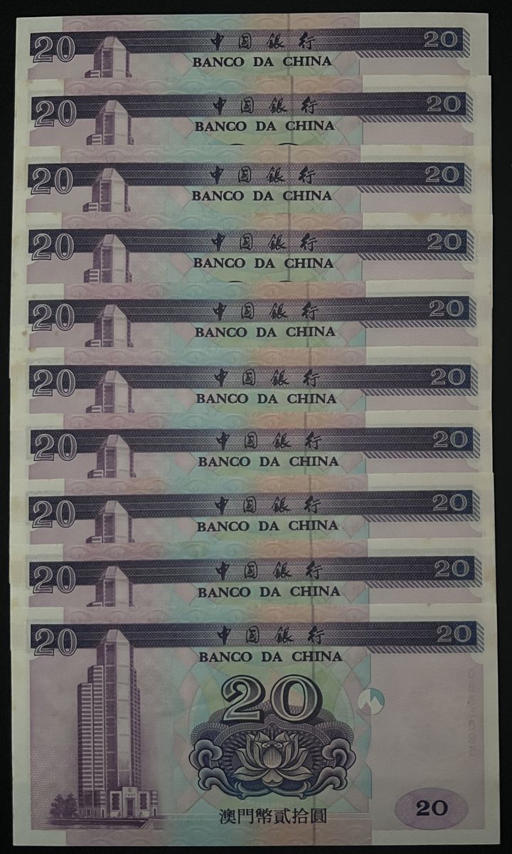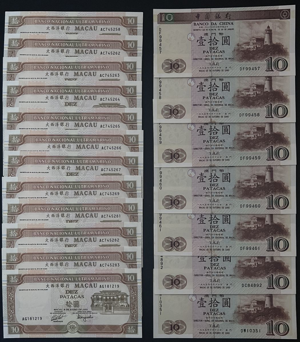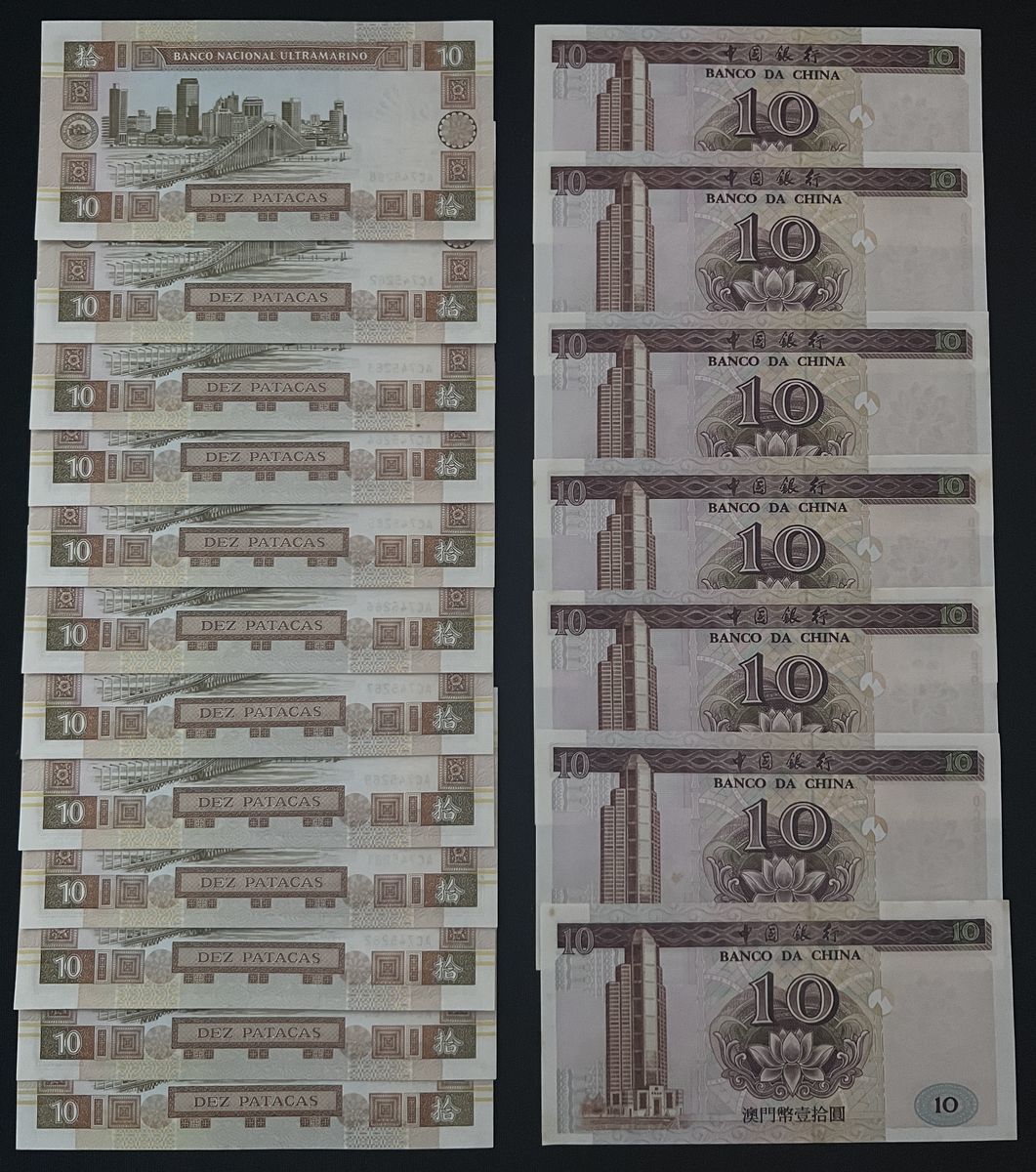澳門紙鈔一組42枚,包括:大西洋海外匯理銀行1944年貳毫九枚、1952年壹百圓註銷票一枚、1981年伍圓四枚、1991年拾圓十二枚、及中國銀行1995年拾圓七枚、1996年貳拾圓十枚,拾圓及貳拾圓大致UNC品相,有發黃,其他F品相