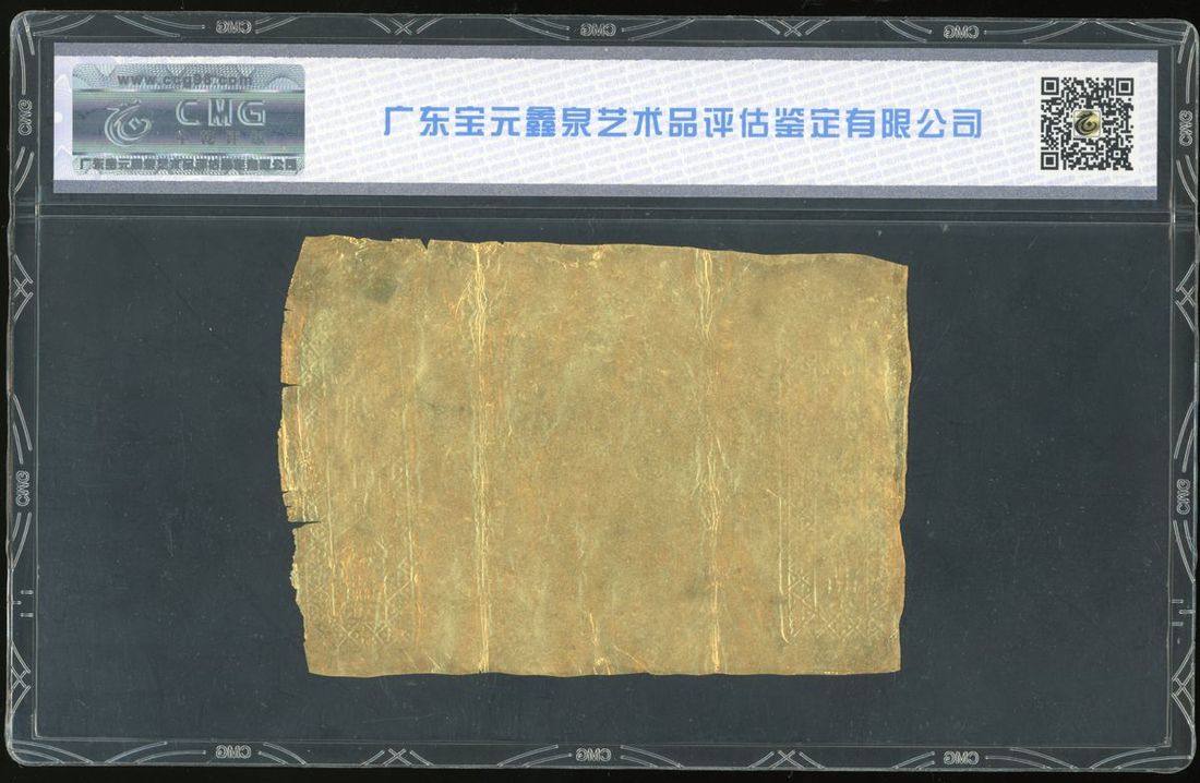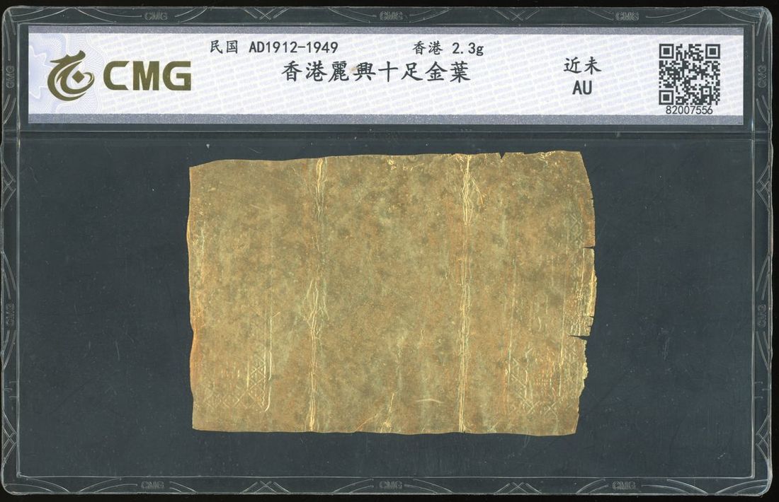 Hong Kong, a 2.3g gold leaf, cir. 1912-1949, uneven rectangular form, embossed with Chinese characters 'Hong Kong Lai Hing Pure Gold Leaf' at left and right, tears at right edge, well preserved, in CMG holder AU.