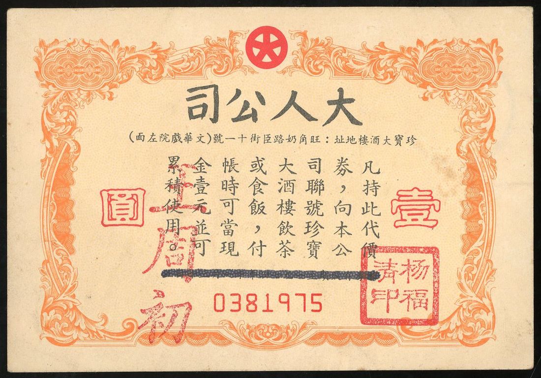 1960-1970年代大人公司旺角珍寶大酒樓壹圓券,EF品相,少見