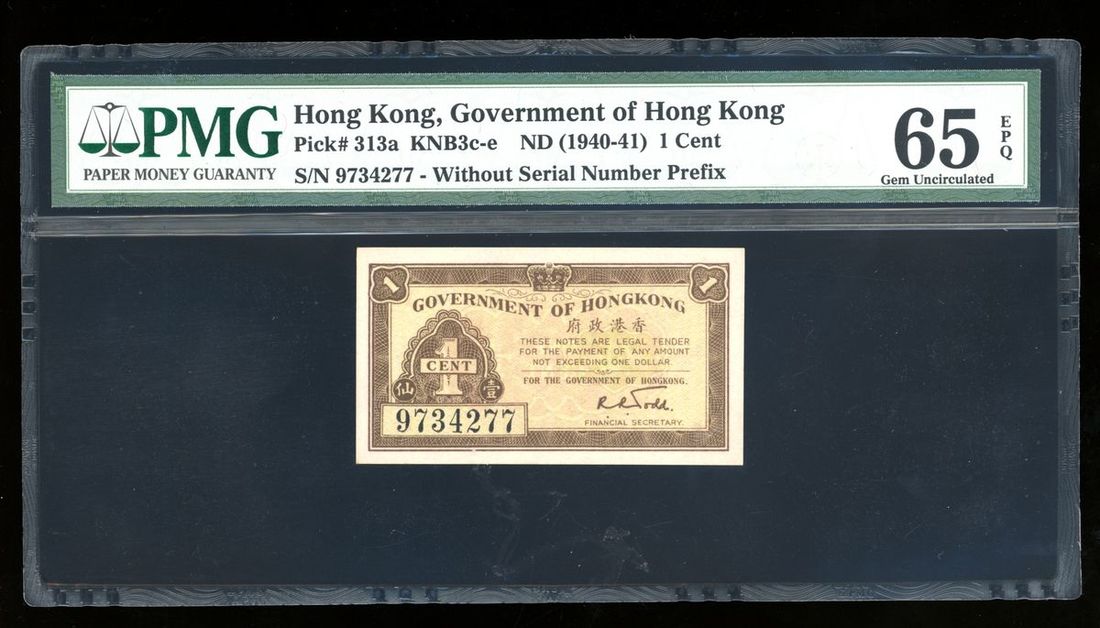Government of Hong Kong, 1 cent, ND(1940-41), serial number 9734277, (Pick 313a), PMG 65EPQ Gem Uncirculated.