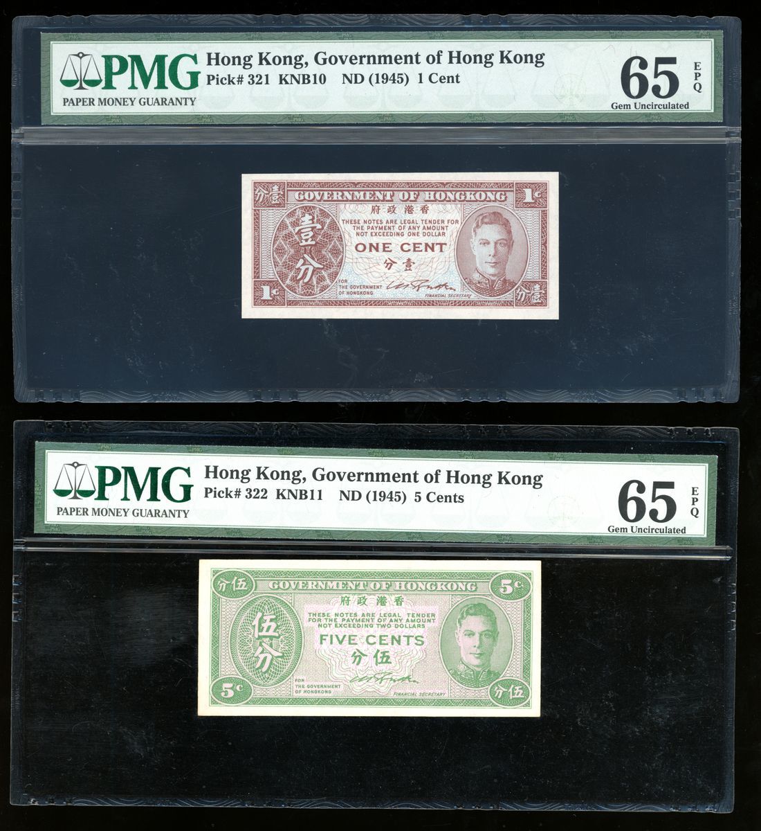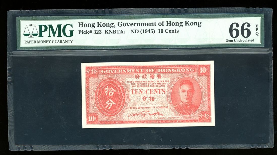 Government of Hong Kong, a group of 3 notes, consists of 1, 5 and 10 cents, ND(1945), no serial number, (Pick 321, 322 and 323), graded PMG 65EPQ, 65PEQ and 66EPQ respectively (3).