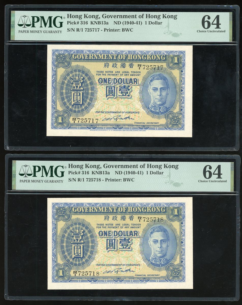 Government of Hongkong, a pair of $1, ND (1940-1941), consecutive serial numbers R/1 725717-718, (Pick 316), both graded PMG 64 Choice Uncirculated (2)