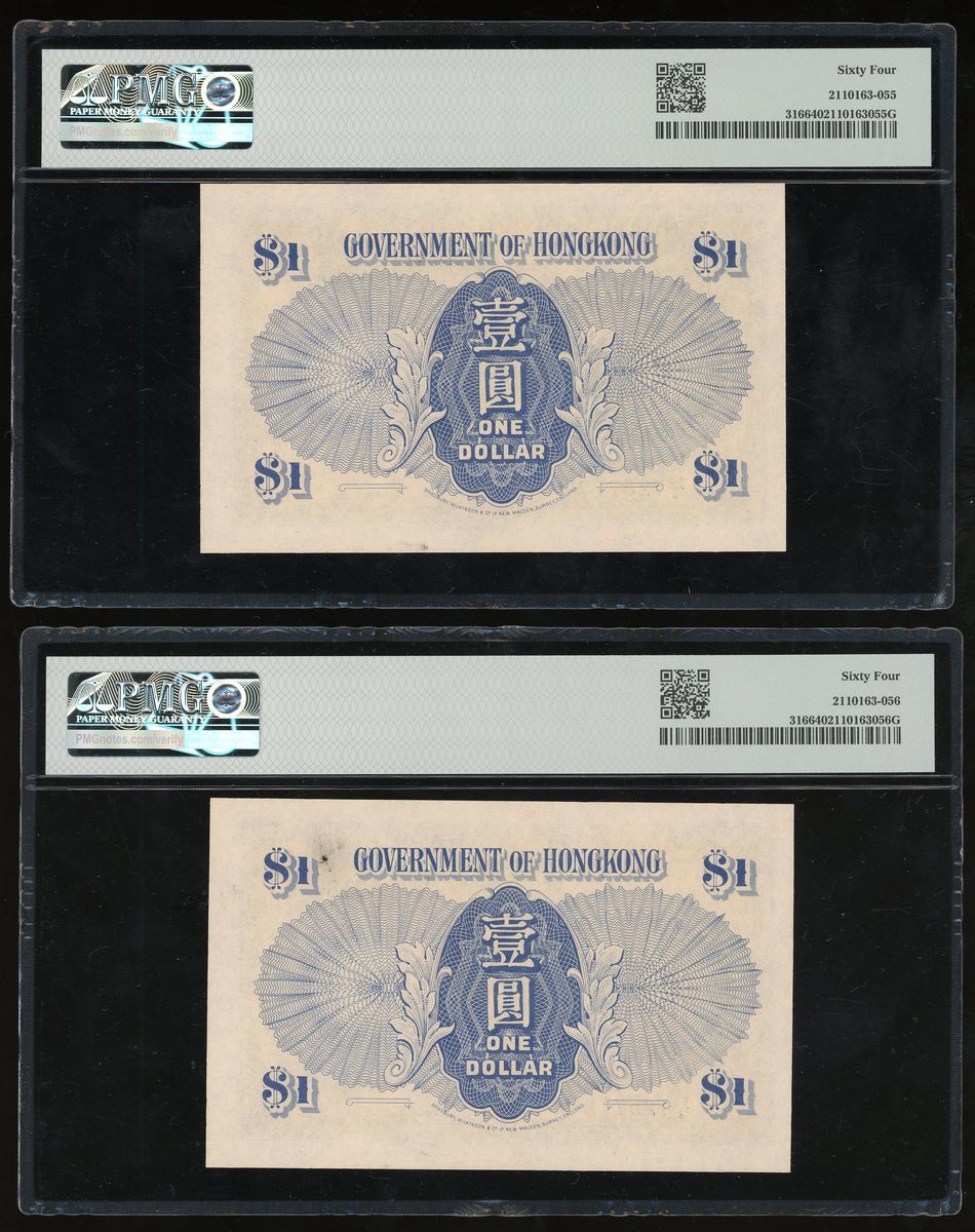 1940-1941年香港政府壹圓一組兩枚,連號R/1 725717-718,PMG均評64