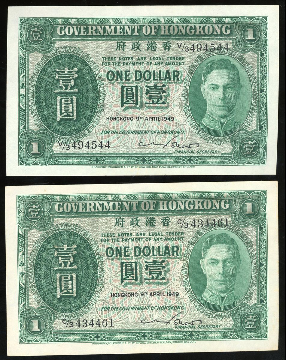 Government of HongKong, $1 (5), ND (1940), 1949, (Pick 316, 324a), blue/yellow $1 with centre crease, good extremely fine, green $1 uncirculated (%)