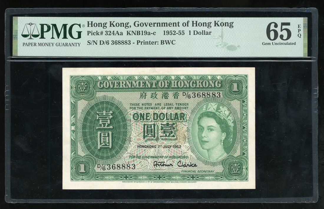 Government of Hongkong, $1, 1.7.1952, serial number D/6 368883, (Pick 324Aa), PMG 65EPQ Gem Uncirculated