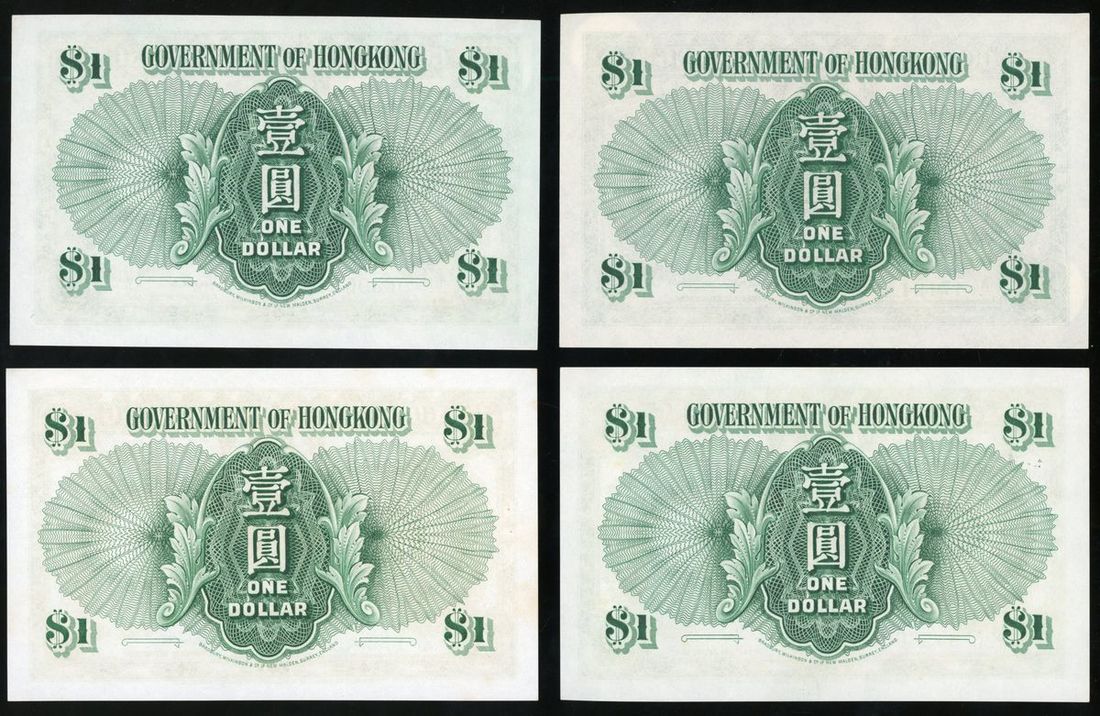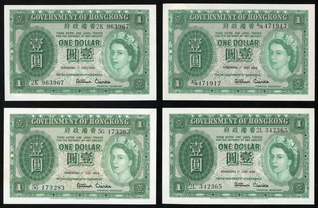 Government of Hong Kong, a group of 4x $1, 1.7.1952, 1.6.1956 (2), and 1.7.1958, serial numbers A/6 471917, 2K 963967, 2L 342365 and 5G 173283, (Pick 324Aa and 324Ab), about uncirculated or above, mild foxing (4).