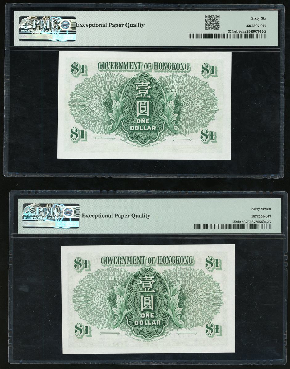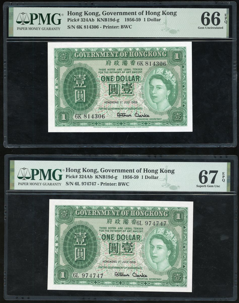 Government of Hong Kong, a pair of $1, 1.7.1959, serial numbers 6K 814306 and 6L 974747, (Pick 324Ab), graded PMG 66EPQ and 67EPQ respectively (2).