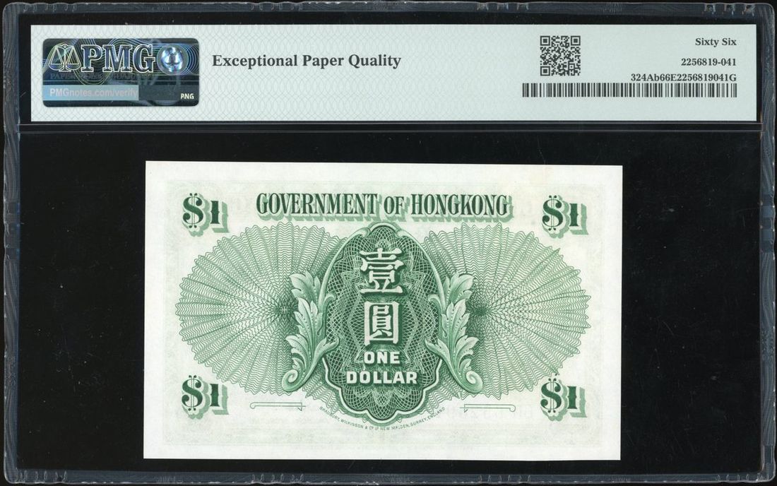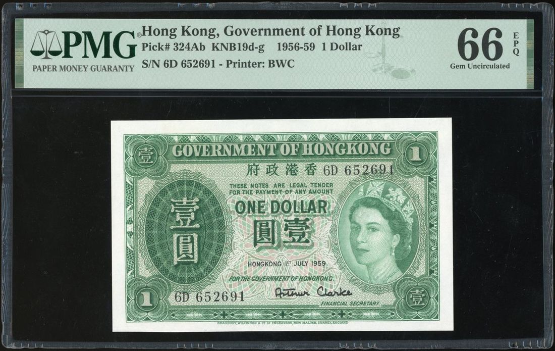 Government of HongKong, $1, 1 July 1959, serial number 6D 652691 (Pick 324Ab), PMG 66EPQ Gem Uncirculated