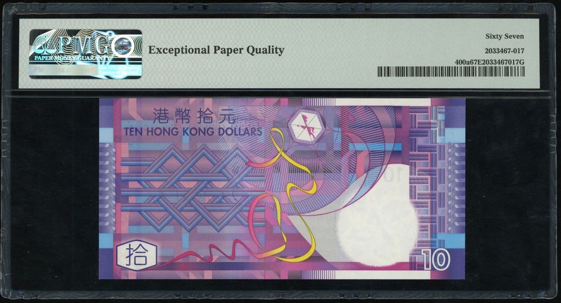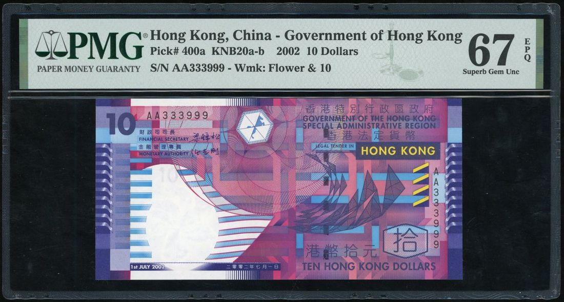 Government of Hong Kong, $10, 2002, first prefix fancy serial number AA333999, (Pick 400a), PMG 67EPQ Superb Gem Uncirculated.