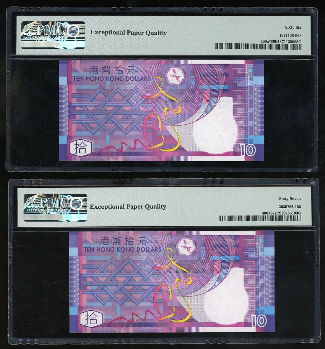 Government of Hong Kong, a pair of $10, 1.7.2002, serial number AA933071 and replacement serial number ZZ266471, (Pick 400a, 400a*), graded PMG 67EPQ Superb Gem Uncirculated and 66EPQ Gem Uncirculated (2)