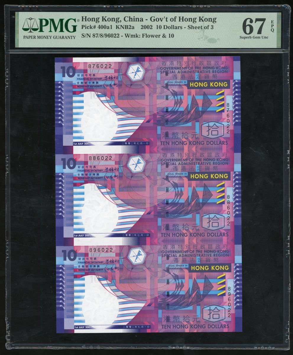 Government of Hong Kong, an uncut sheet of 3x $10, 1.7.2002, serial numbers 876022, 886022, 896022, (Pick 400a1), PMG 67EPQ Superb Gem Uncirculated