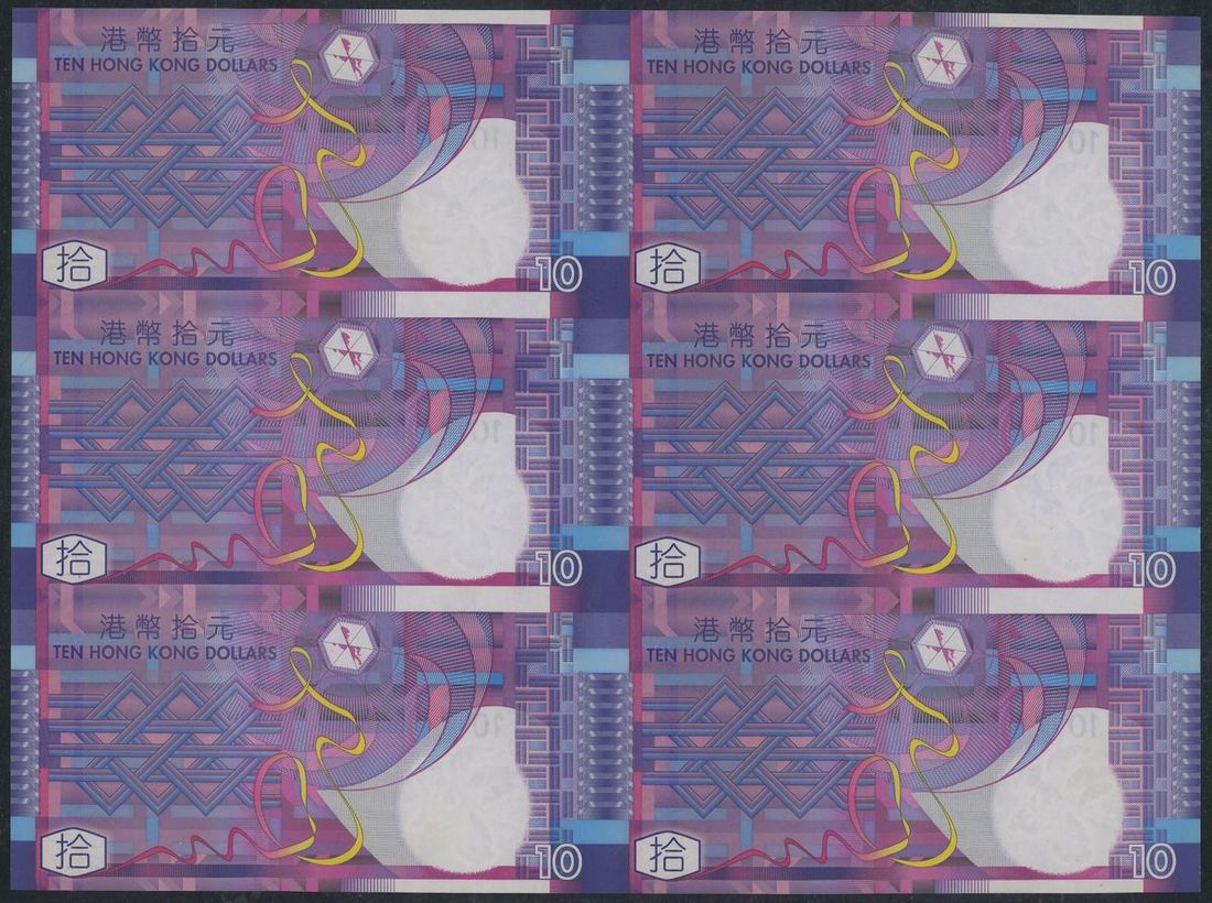 Government of Hong Kong, a uncut sheets of 6x $10, commemorative issue by The Community Chest, 1.7.2002, serial numbers 243509, 253509, 263509, 333509, 343509 and 353509, (Pick 400a2), uncirculated, in original cardboard tube of issue with the certificate of authenticity, certificate #01610.
