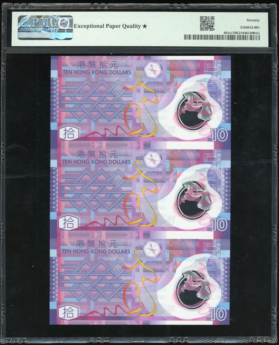 Government of Hong Kong, $10, uncut sheet of 3, 1.4.2007, serial numbers 75/76/770707, (Pick 401a1), PMG 70EPQ* Seventy Gem Uncirculated, the highest grade in PMG population report.