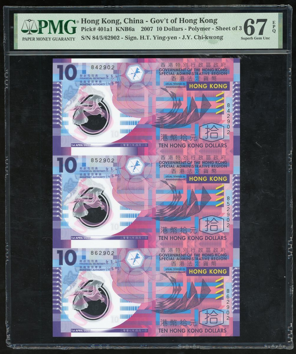 Government of Hong Kong, an uncut sheet of 3x polymer $10, 1.4.2007, serial numbers 842902, 852902, 862902, (Pick 401a1), PMG 67EPQ Superb Gem Uncirculated