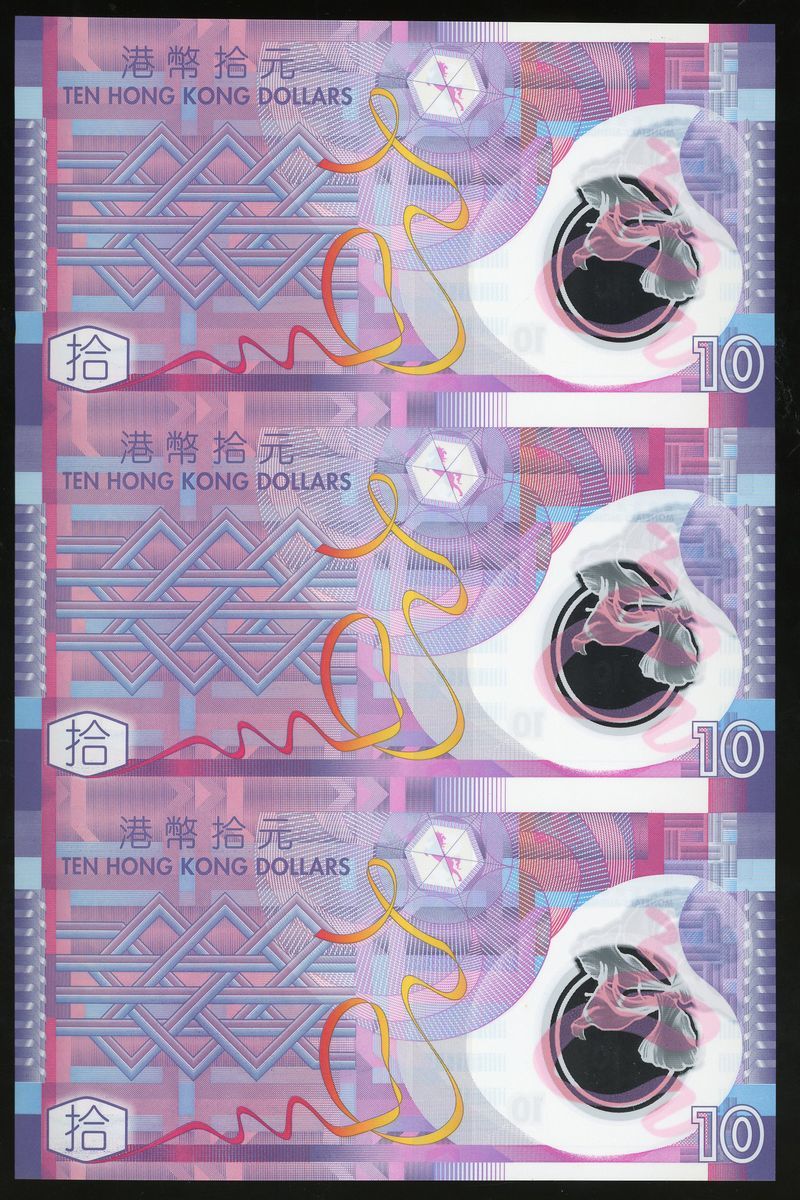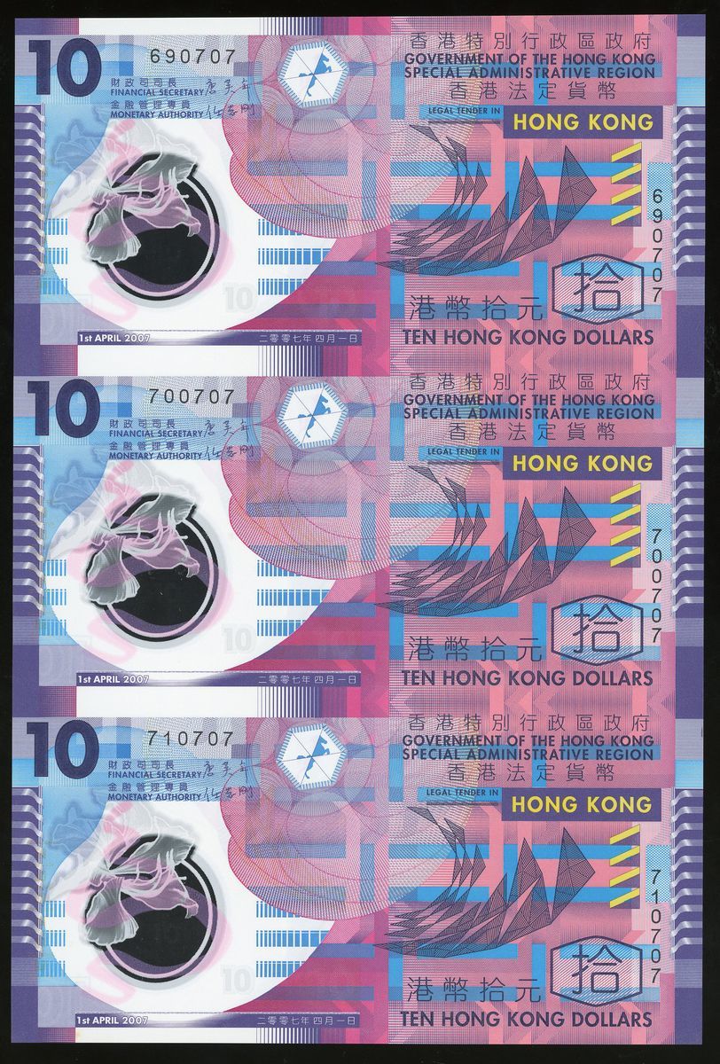Government of HongKong, polymer uncut sheet of three $10, 2007, serial numbers 690707, 700707, 710707, (Pick 401a1), uncirculated