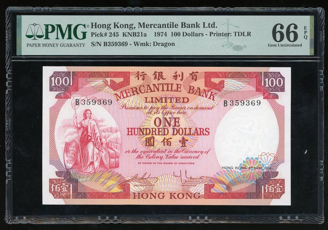 Mercantile Bank Limited, Hong Kong, $100, 4.11.1974, serial number B359369, (Pick 245), PMG 66EPQ Gem Uncirculated