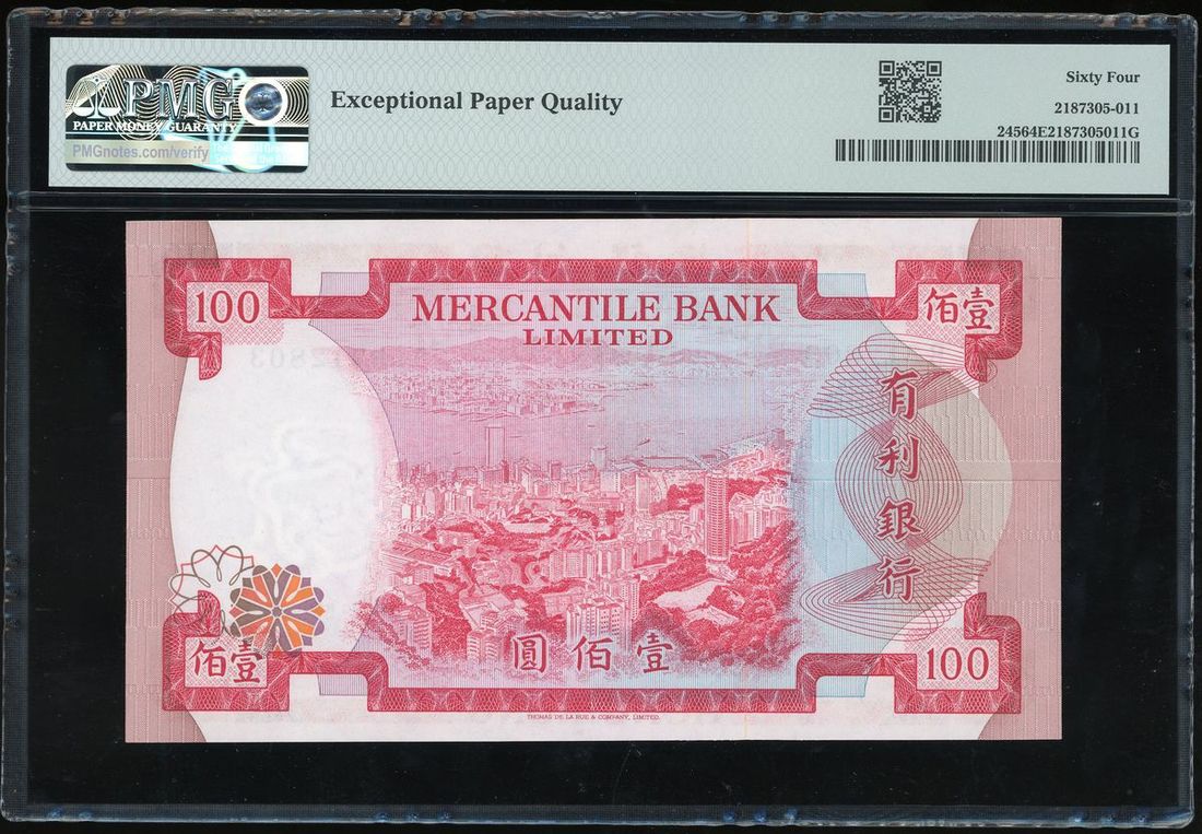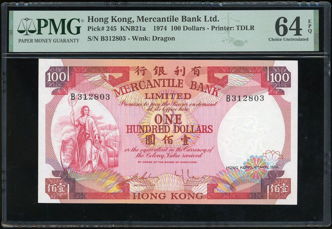 Mercantile Bank Limited, Hong Kong, $100, 4 November 1974, serial number B213803, (Pick 245), PMG 64EPQ