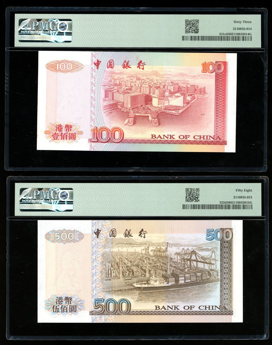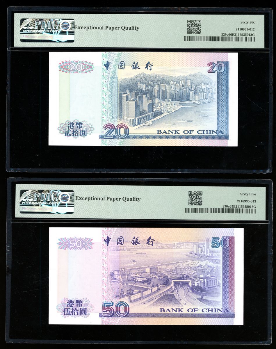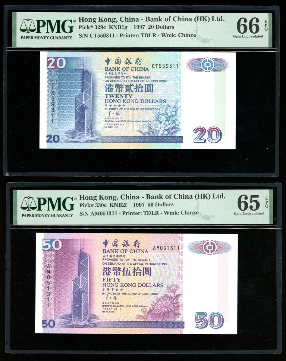 1997年中國銀行一組5枚,貳拾圓、伍拾圓、壹佰圓、伍佰圓及壹仟圓,全部編號均以11結尾,PMG分別評66EPQ、65EPQ、63、58及63