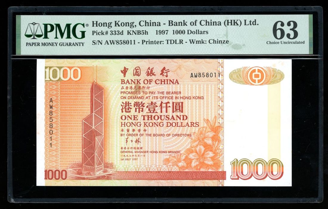 Bank of China, Hong Kong, a group of 5 notes, consists of $20, $50, $100, $500 and $1000, 1.7.1997, complete set ending with same serial number '11',