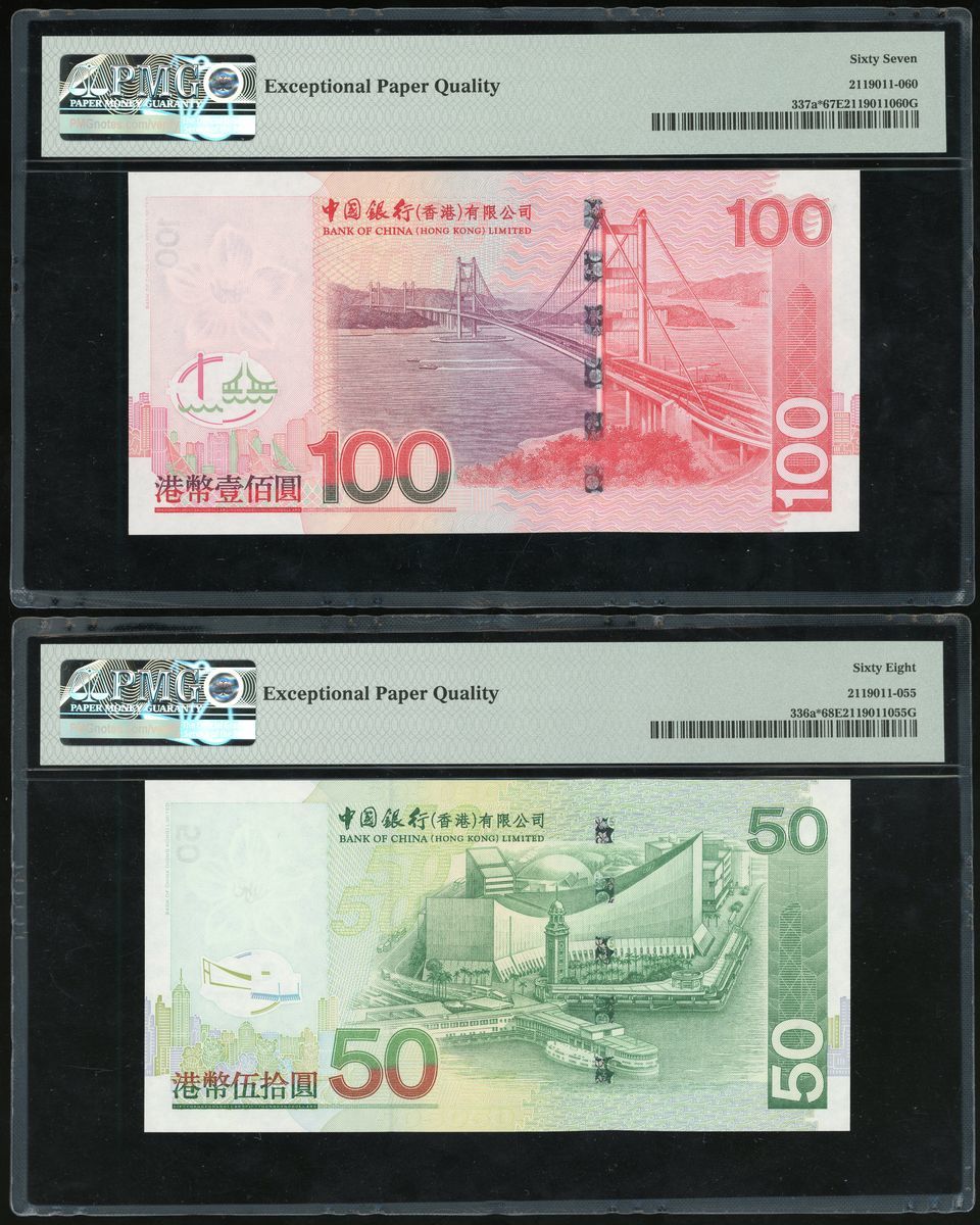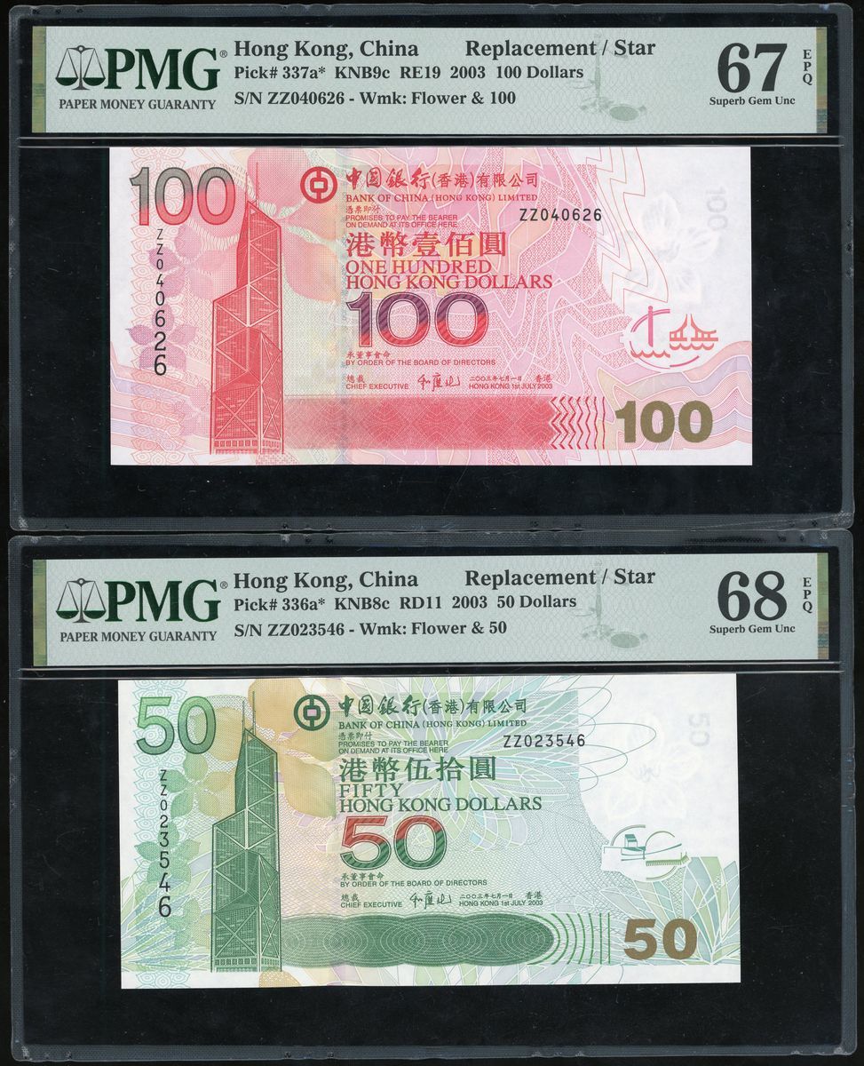 Bank of China, Hong Kong, a pair of replacement notes, $50 and $100, 2003, serial numbers ZZ023546 and ZZ040626, (Pick 336a* and 337a*), graded PMG 68EPQ and 67EPQ Superb Gem Uncirculated respectively (2)