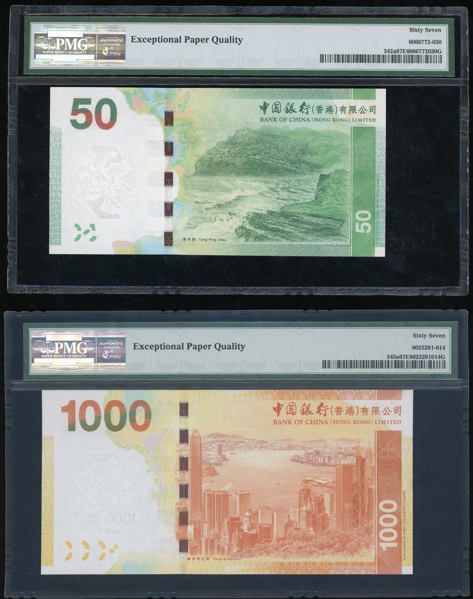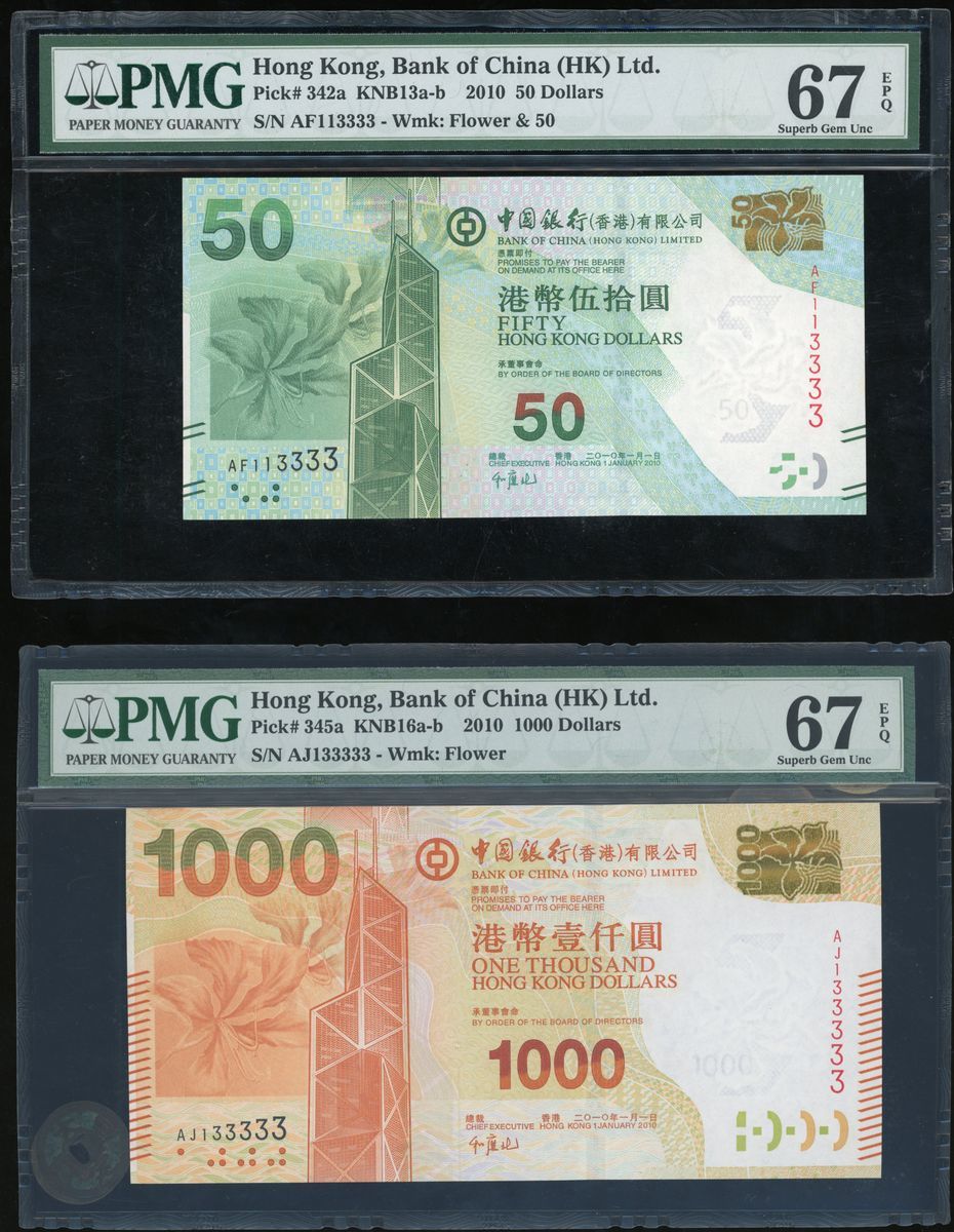Bank of China, Hong Kong, a pair of $50 and $1000, 1.1.2010, fancy serial numbers AF113333 and AJ133333, (Pick 342a and 345a), both graded PMG 67EPQ Superb Gem Uncirculated (2).