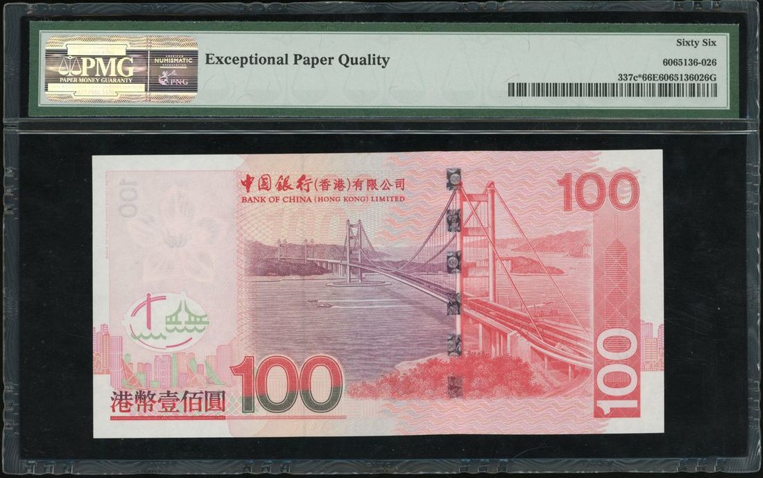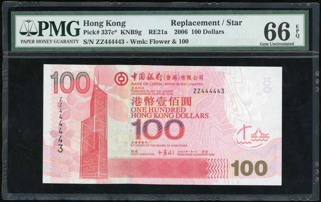 Bank of China, Hong Kong, $100, replacement, 1.1.2006, near-solid serial number ZZ444443, (Pick 337*), PMG 66EPQ Gem Uncirculated.