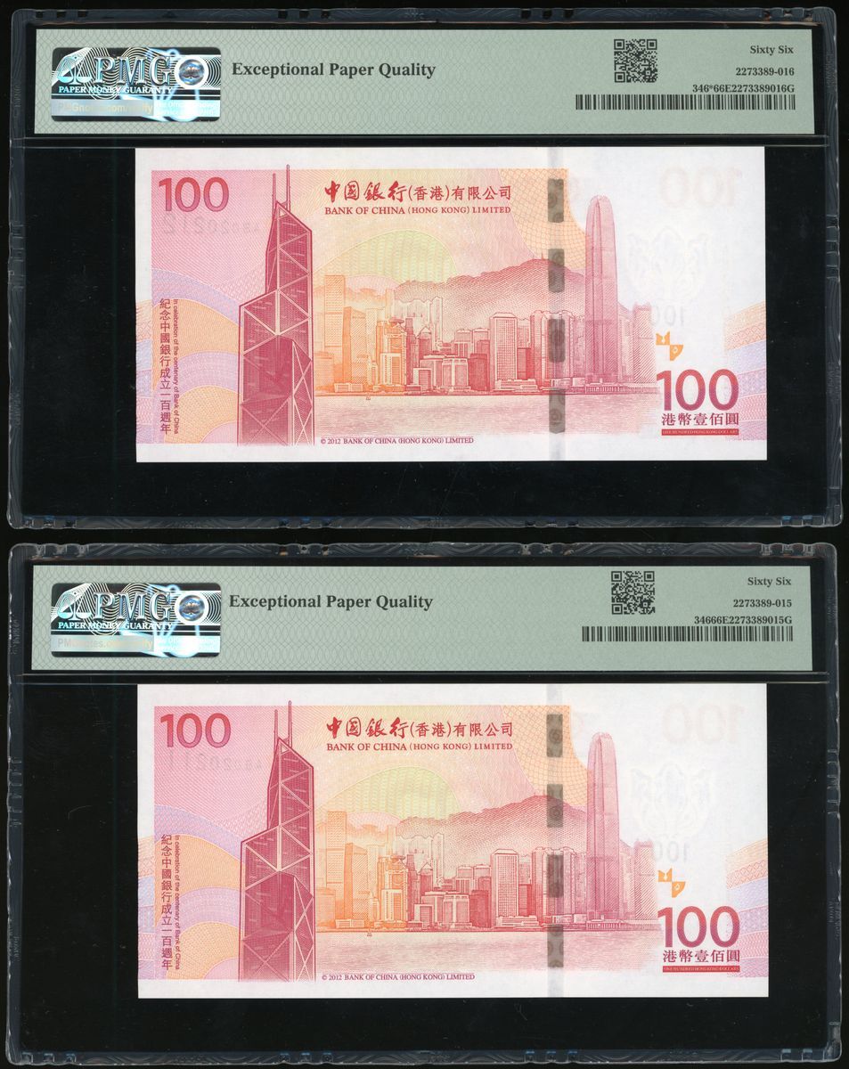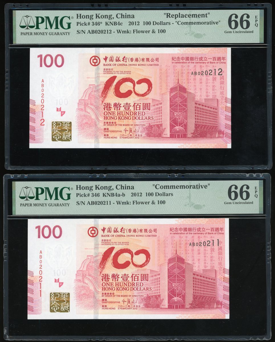 Bank of China (Hong Kong), a consecutive pair of $100, 5.2.2012, commemorative of the centenary of the bank, serial numbers AB020211-12, 012 is replacement, (Pick 346 and 346*), both graded PMG 66EPQ Gem Uncirculated (2).